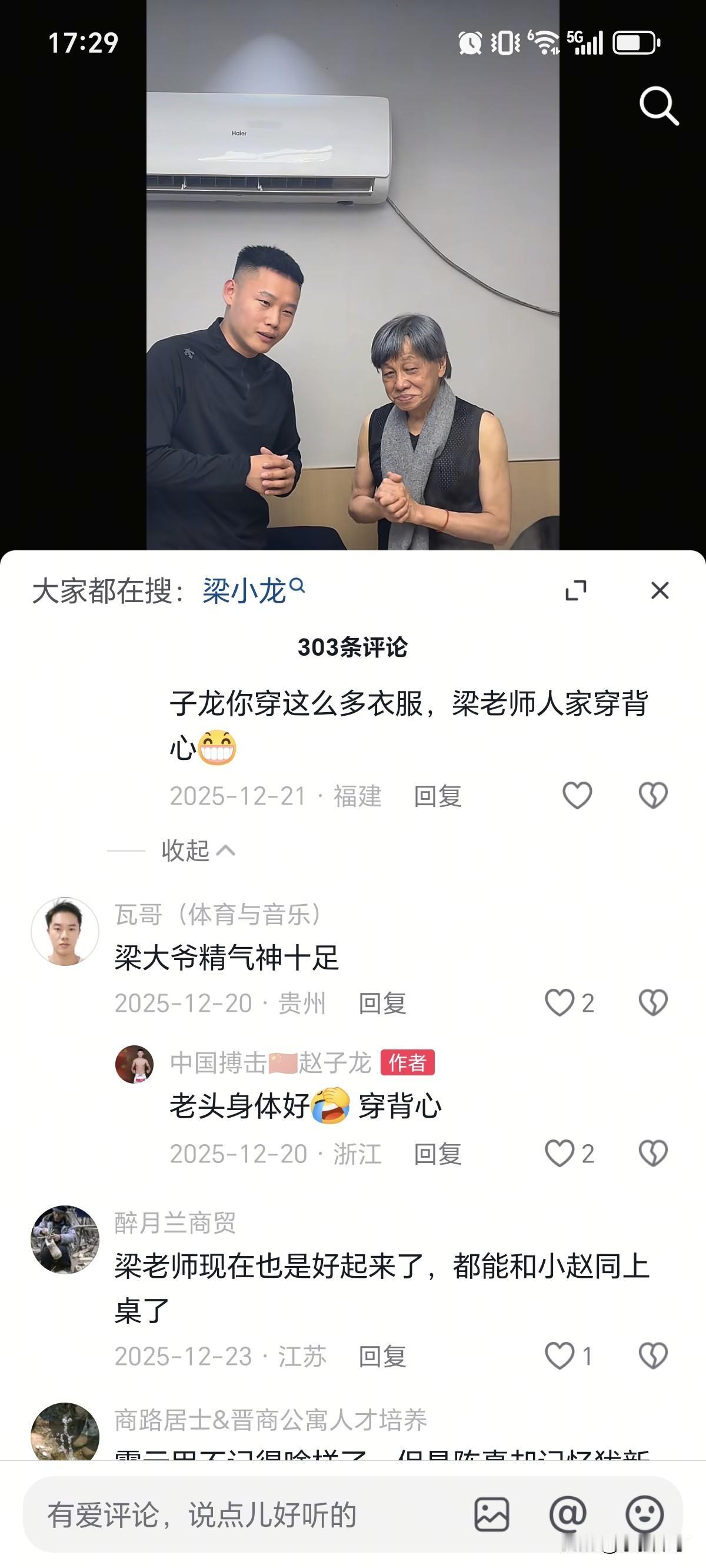 让人意外,77岁的梁小龙去世了,曾在《功夫》中饰演“火云邪神”,从去年12月20号的视频可以看出,身体状态一直很好,当天在浙江和搏击赵子龙一起在包间吃饭,对方是30多岁的小伙子,由于怕冷,都穿了长袖外套,可梁小龙77岁,竟然穿了短袖,露出了胳膊上的肌肉,在场众人都夸赞精力十足。 而餐位上,可乐,果汁,碗里面,大虾,羊肉…非常丰富,也说明没什么毛病,需要服药去忌口。今天赵子龙在下午4点左右,也发布了视频去悼念梁小龙,并正在去香港的路上,送最后一程。网友对于死因也是好奇,于是在评论区询问,赵子龙回复说:保密!估计是知道内幕,但涉及个人隐私不方便透露。 一路走好,明天和意外永远不知道哪个先来[流泪][流泪][流泪]。