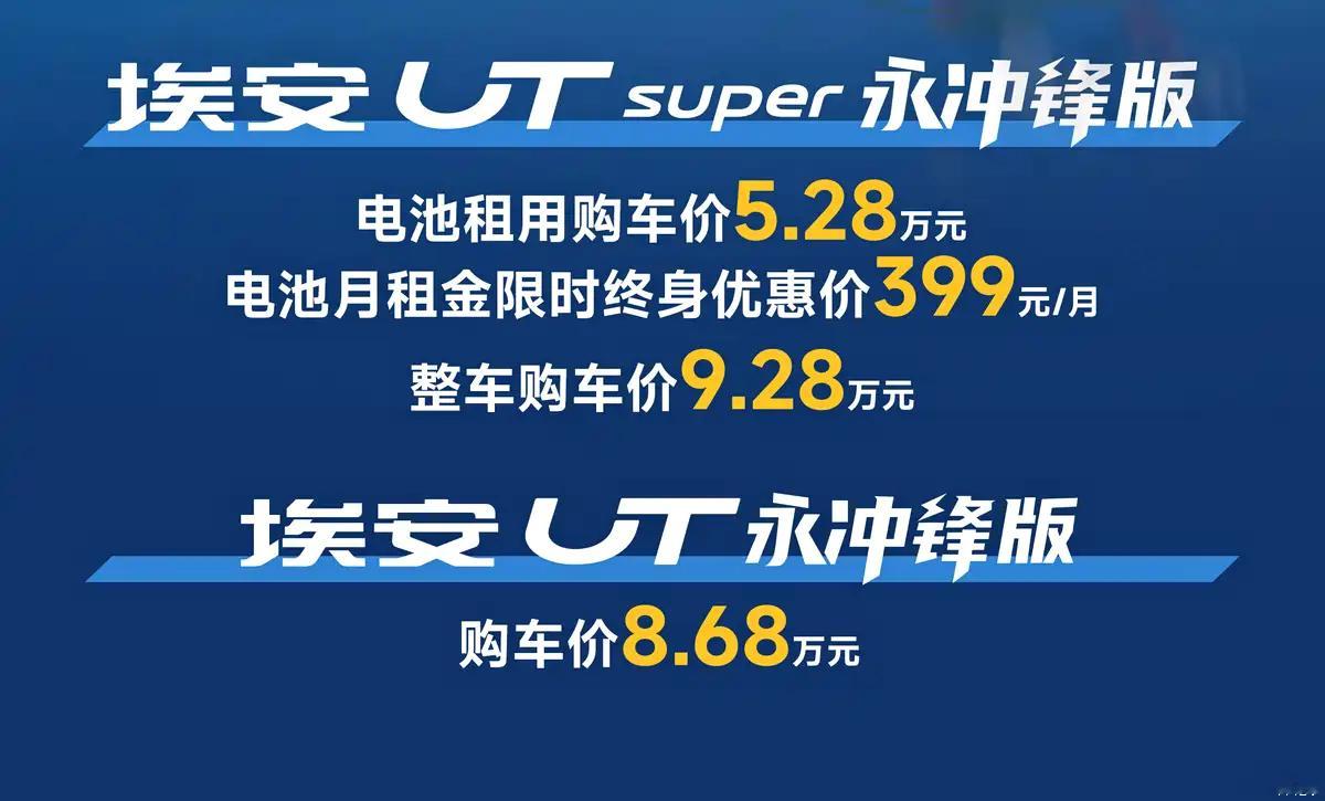 电池租用售5.28万起,埃安UT系列永冲锋版上市。