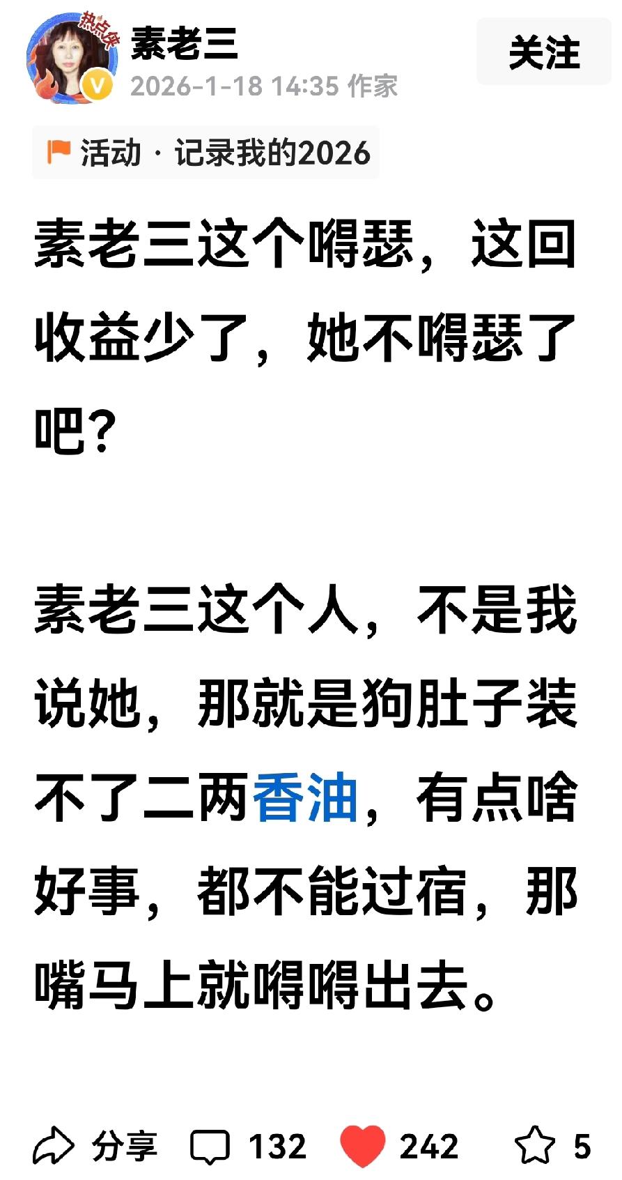 素老三今天“疯了”,她不骂别人,她今天专骂自己,搞得我对她的账户进行了多次的确认! 素老三说“素老三”咱不晒收益了?因为收益降低了,没法晒了! 素老说“素老三”管他的儿子,她儿子不听他的,其实就是多事,她应该好好管管自己,得了一点钱就拿出来嘚瑟!这是穷人的表现,穷人一见钱,生怕别人不知道似的! 素老三说“素老三”还想写长篇小说,写了五六篇,不如人家写一篇,人家一篇就可以住上电梯房,而她写了那么多就只能住上小区房,几十平方米,小区的大门连保安都请不上! 素老三还说“素老三”是穷疯了,跑到头条来要钱,现在好了,收益降低了,头条也要不了多少钱了! 估计这段时间,由于头条收益的降低,素老三可能真的受不了啦!不然素老三怎么会骂“素老三”呢? 说实话!素老三是真的不容易,因为头条创作是她的工作,虽然以前她月入过万,但这是她收入的全部来源,他的退休金只有1400元,不比其他人的退休工资高,有许多退休工资高达万元,轻轻松松月月领取,而素老三不一样,她的收入全部来自她的拼命工作。 素老三很真实,她生活得很不容易!