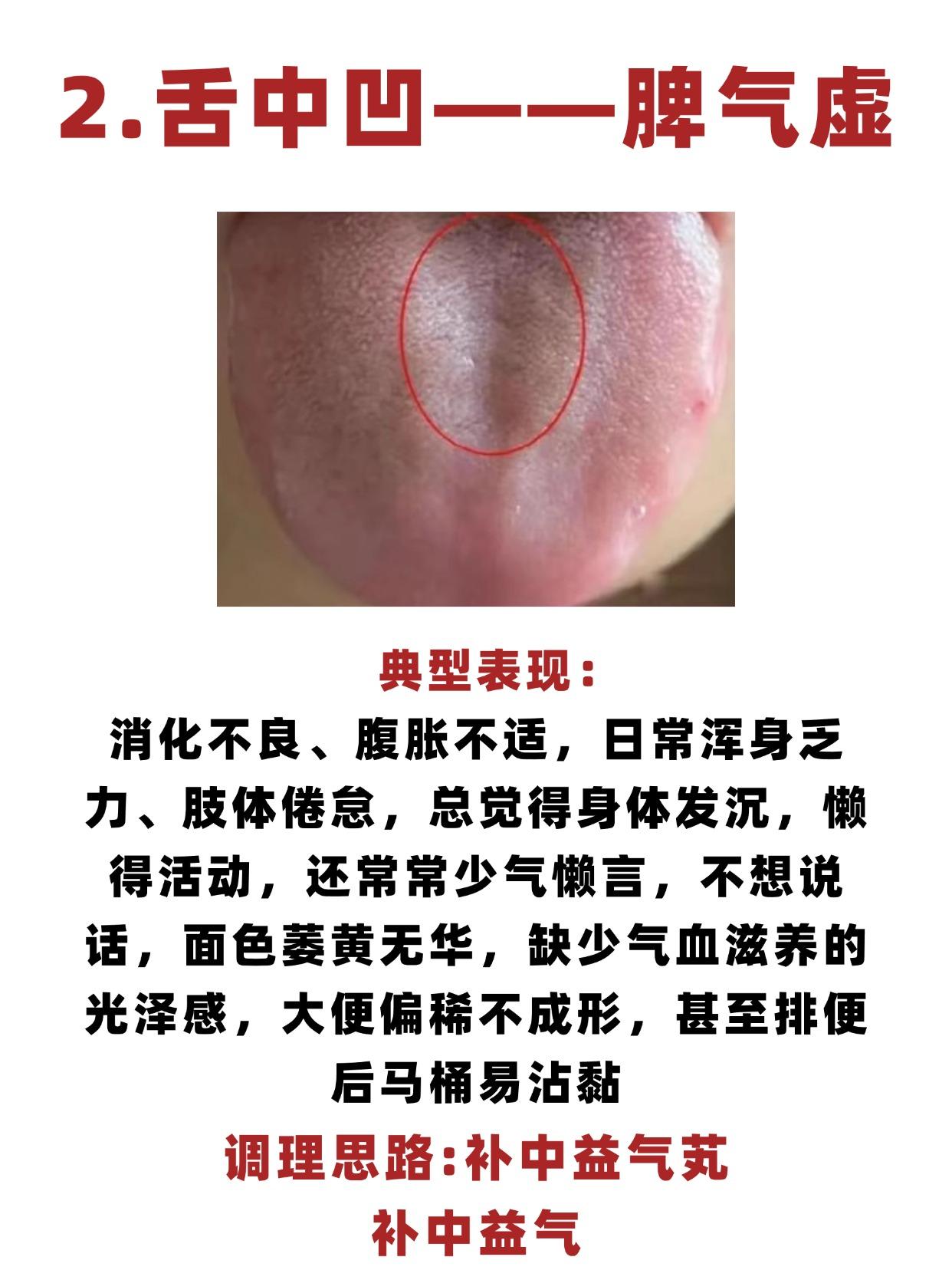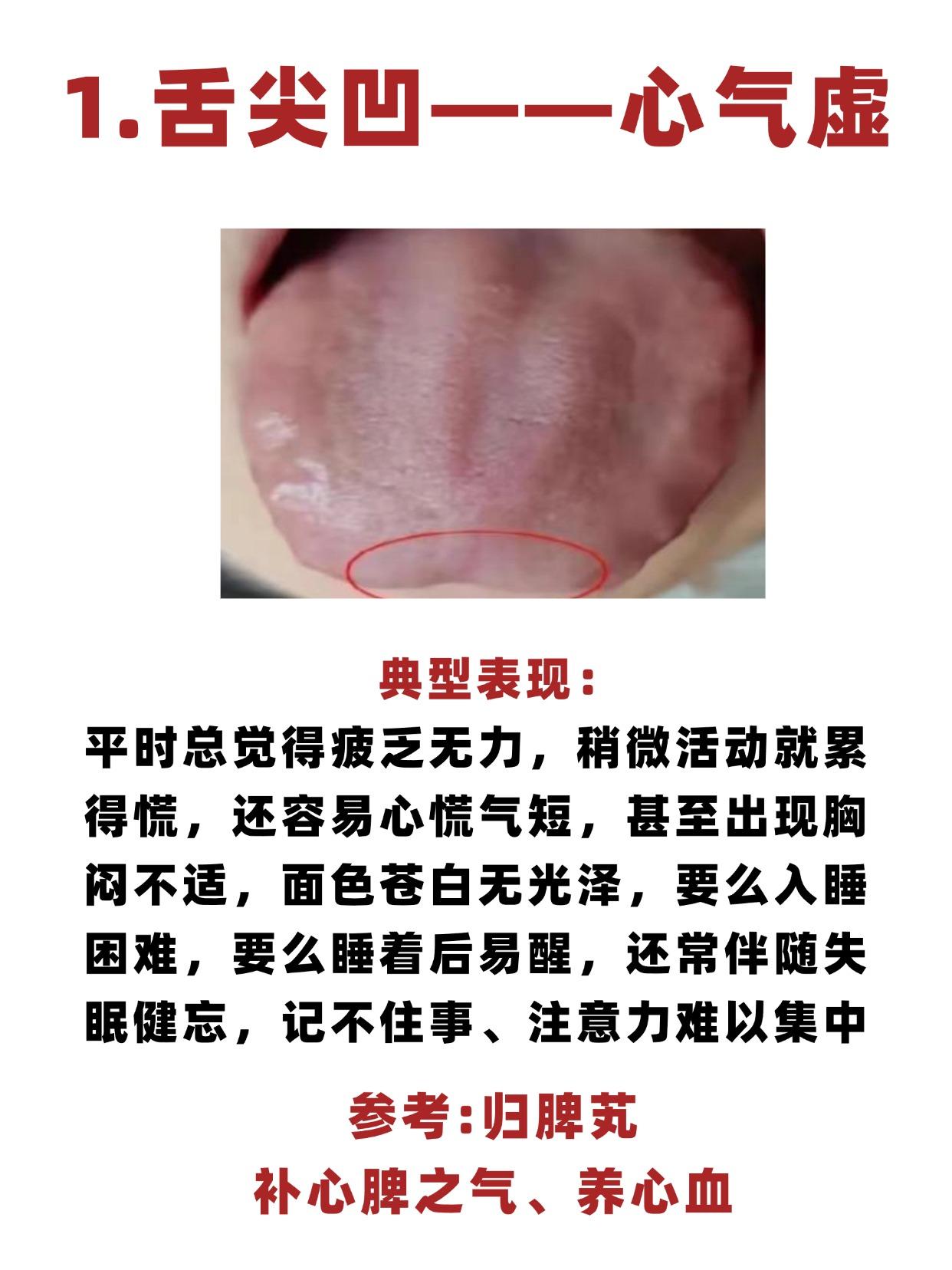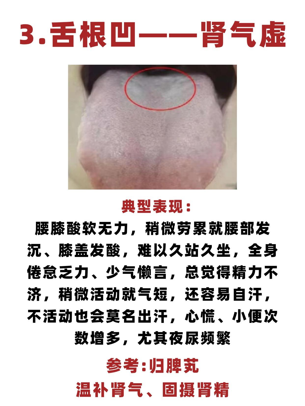 舌尖凹——心气虚、舌中凹——脾气虚、舌根凹——肾气虚,3个中成药,健脾补肾养心,补足身体亏虚! 1.舌尖凹一一心气虚 典型表现:平时总觉得疲乏无力,稍微活动就累得慌,还容易心慌气短,甚至出现胸闷不适,面色苍白无光泽,要么入睡困难,要么睡着后易醒,还常伴随失眠健忘,记不住事、注意力难以集中 参考:归脾芄,补心脾之气、养心血 2.舌中凹一一脾气虚 典型表现:消化不良、腹胀不适,日常浑身乏力、肢体倦怠,总觉得身体发沉,懒得活动,还常常少气懒言,不想说话,面色萎黄无华,缺少气血滋养的光泽感,大便偏稀不成形,甚至排便后马桶易沾黏 调理思路:补中益气芄 3.舌根凹一一肾气虚 典型表现:腰膝酸软无力,稍微劳累就腰部发沉、膝盖发酸,难以久站久坐,全身倦怠乏力、少气懒言,总觉得精力不济,稍微活动就气短,还容易自汗,不活动也会莫名出汗,心慌、小便次数增多,尤其夜尿频繁 参考:归脾芄温,补肾气、固摄肾精