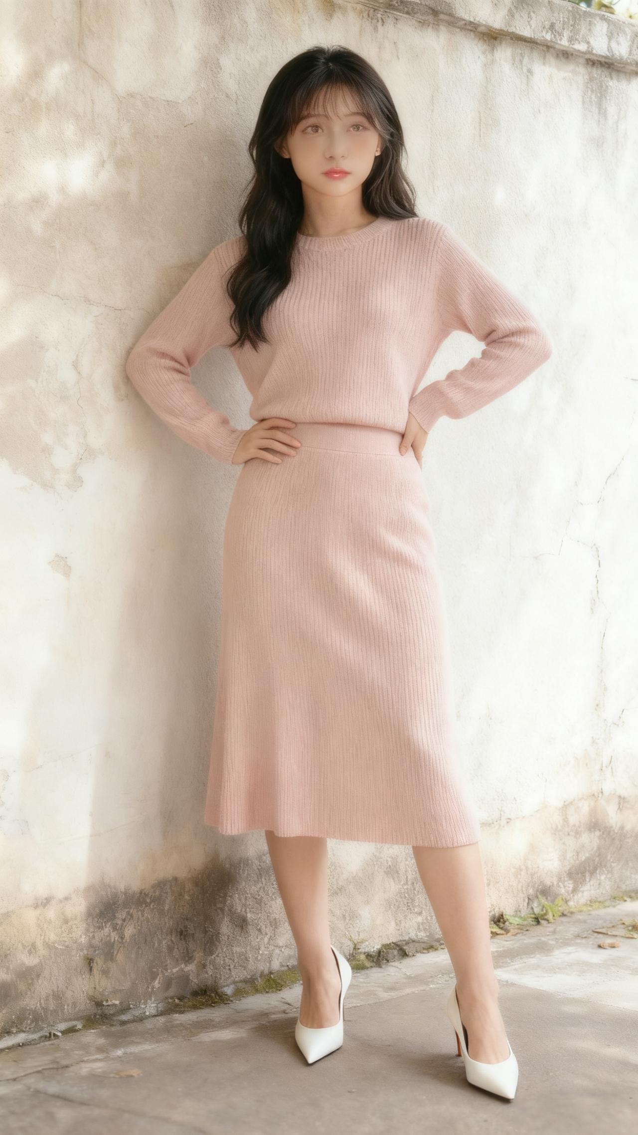 温柔的浅粉色针织套装,上衣与同色系半裙的修身剪裁贴合身形,尽显温婉优雅。搭配一双白色尖头高跟鞋,整体造型简约精致,在明亮的空间里更显气质柔和。 温柔粉色穿搭