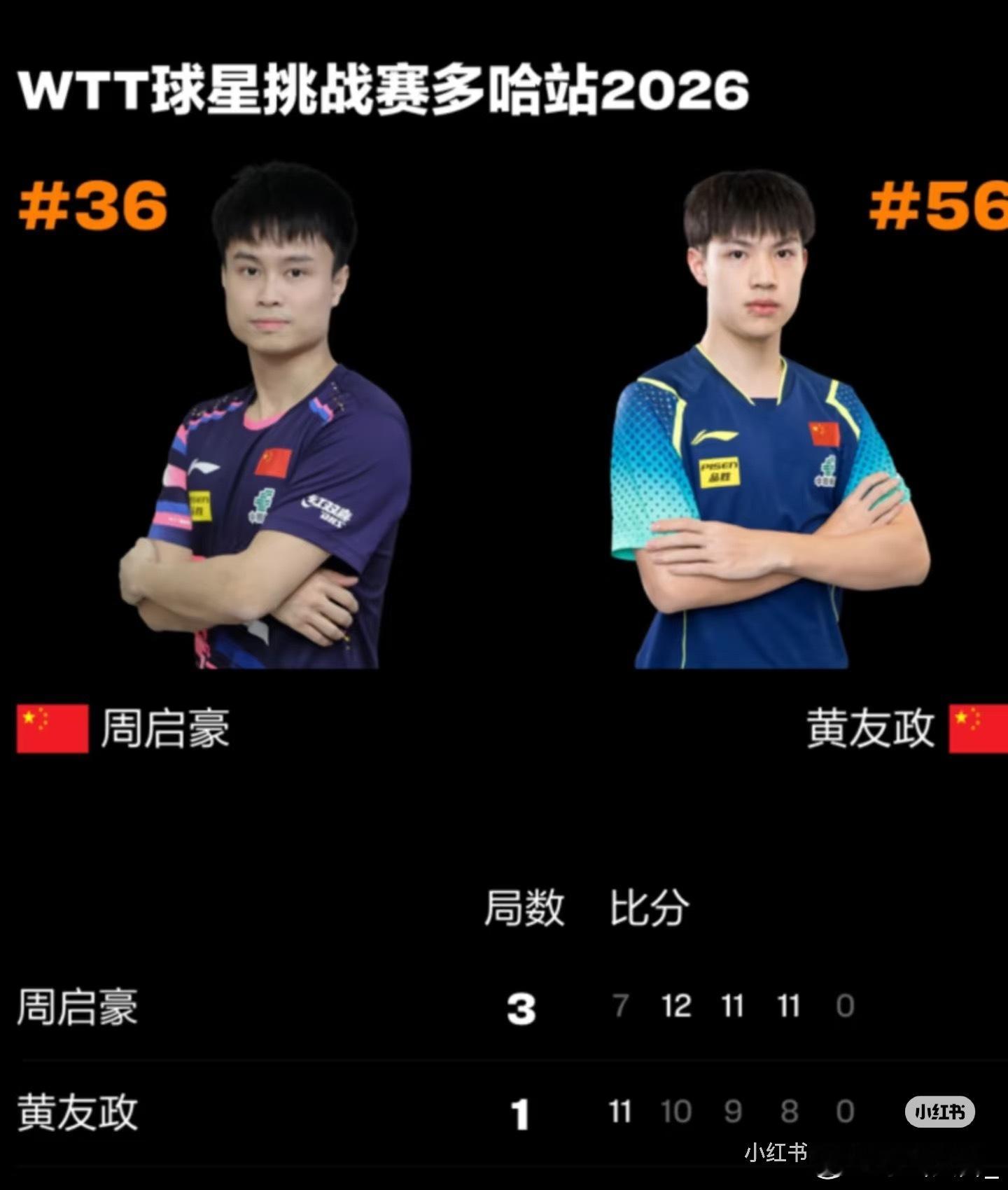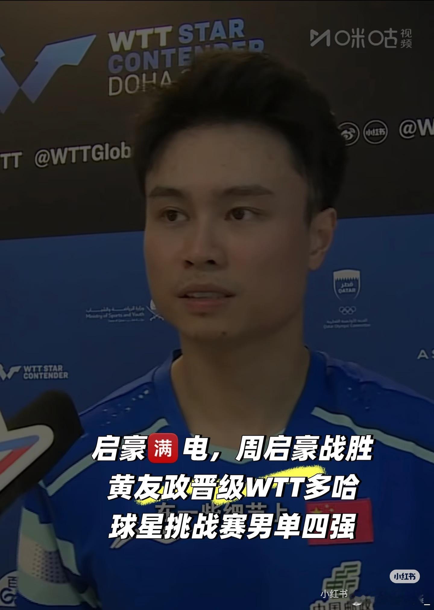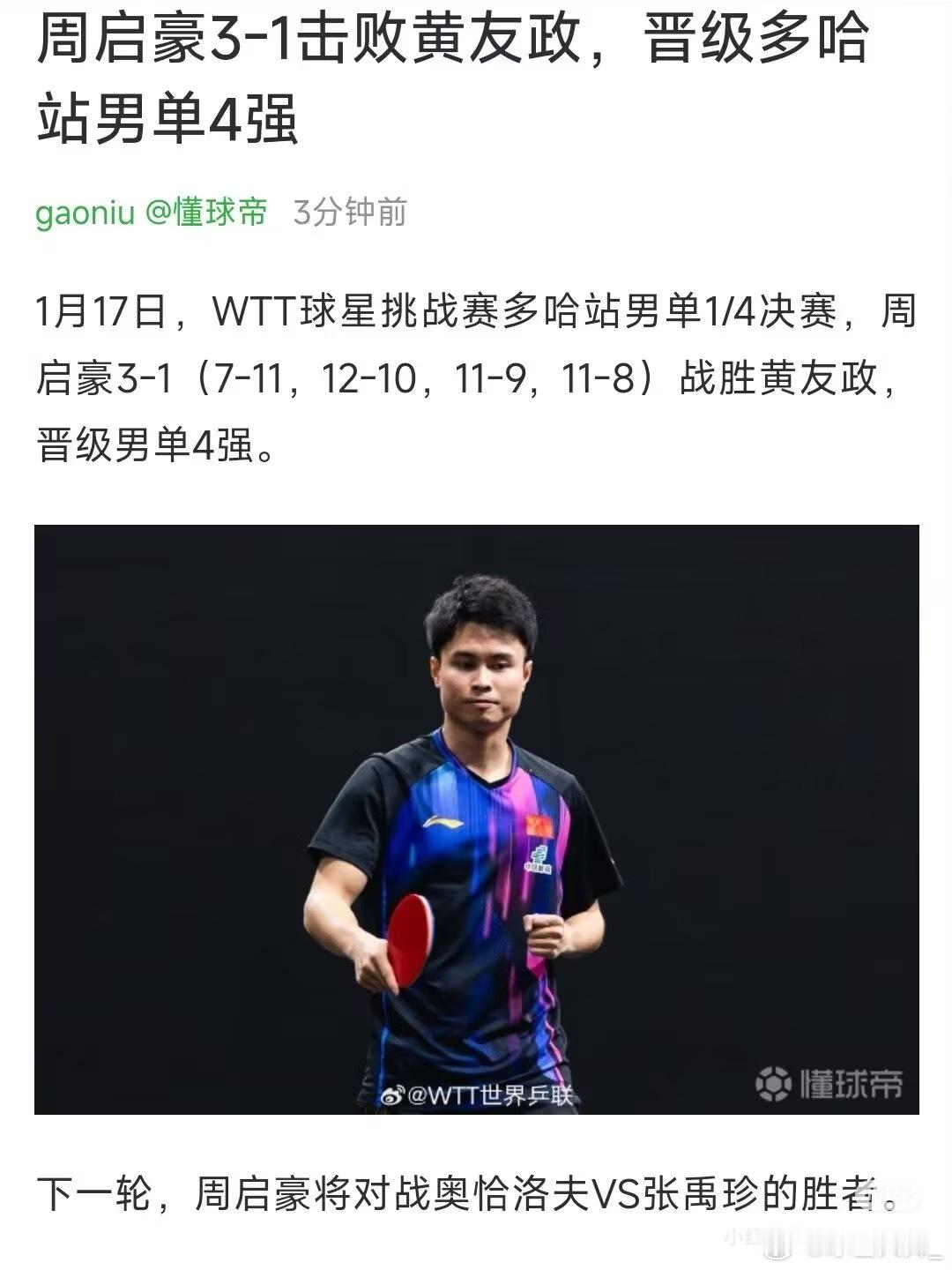 周启豪进男单4强1月17日,WTT球星挑战赛多哈站男单1/4决赛,周启豪3-1(7-11,12-10,11-9,11-8)战胜黄友政,晋级男单4强。
