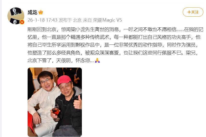 周星驰悼念梁小龙成龙发博悼念梁小龙 著名功夫影星梁小龙去世,18日晚,曾合作《功夫》的周星驰晒旧照悼念他:“永远怀念梁小龙先生。”也晒出两人的合影,称赞他是每一种都能打出自己风格的功夫高手:“北京下雪了,天很阴,怀念您…🙏”