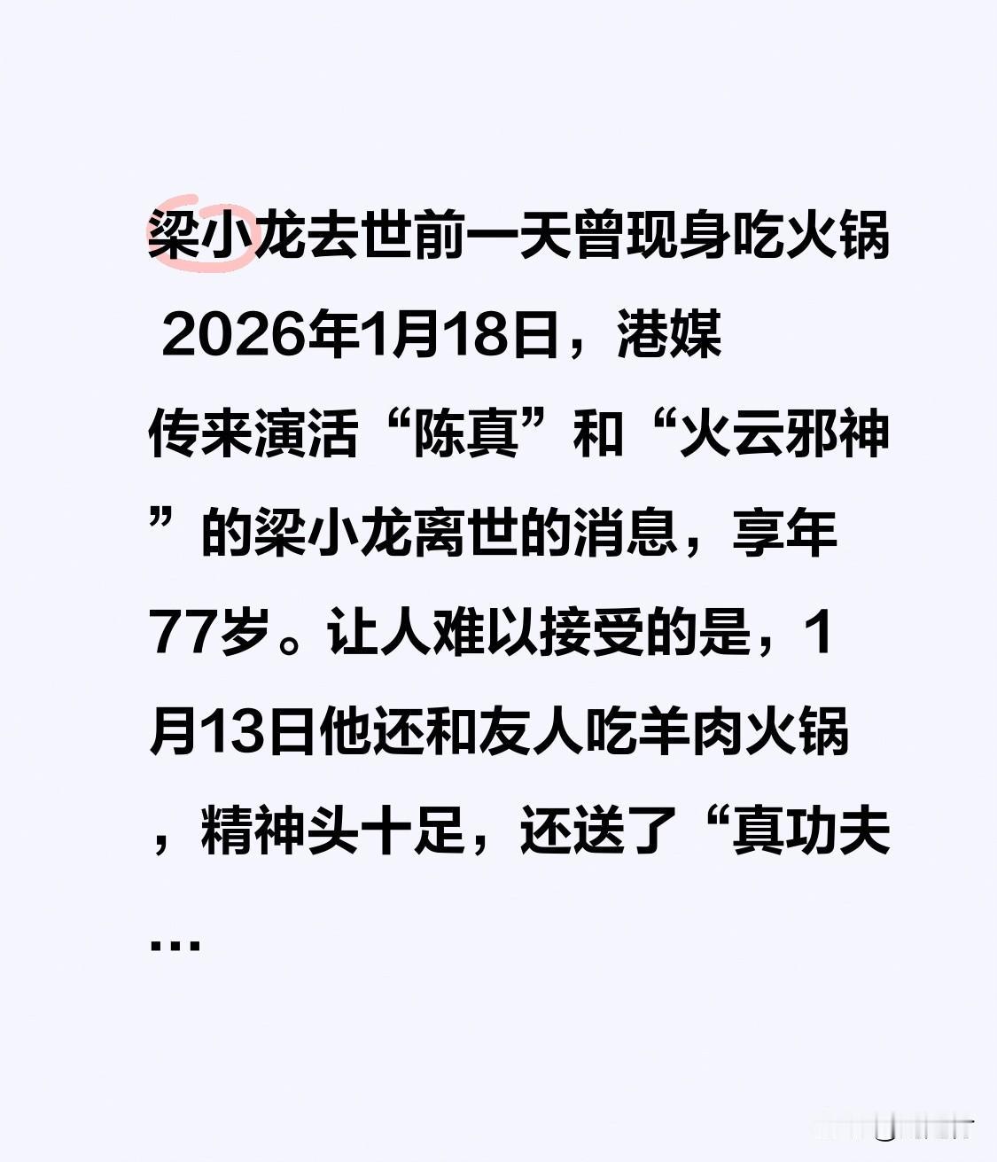 梁小龙去世前一天曾现身吃火锅 梁小龙去世前一日曾现身吃火锅 2026年1月18日,港媒传出曾将“陈真”与“火云邪神”演绎得淋漓尽致的梁小龙离世的噩耗,享年77岁。令人难以接受的是,1月13日他还与友人一同吃羊肉火锅,精神抖擞,还赠送了“真功夫”字画。 梁小龙早年凭借北派腿法闯荡武行,荣获过全港搏击冠军,80年代踢牌匾的经典镜头至今令人记忆犹新,后来还成为了《功夫》里的“火云邪神”。然而在他离世后,其社交账号仍在更新生前片段,显然是运营方在消费逝者,这让网友们义愤填膺。家属于1月26号在深圳为其出殡,希望低调处理后事。唉,一代武星就此陨落,愿他安息。