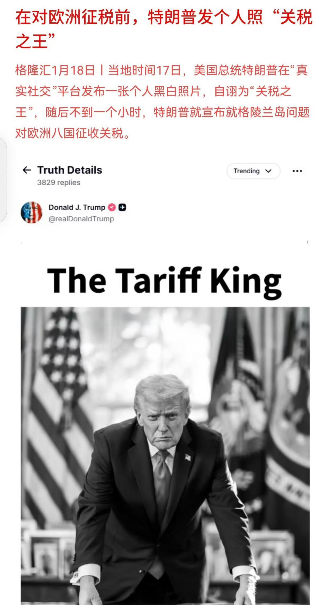 在对欧洲征税前,特朗普发个人照“关税之王”