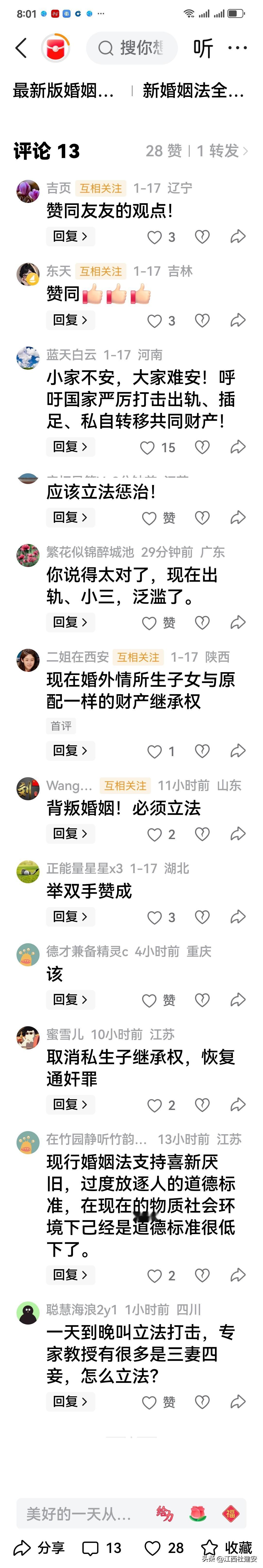 我江西杜建安今日头上的学友兄弟姐妹,我一直都在看你们在评论区给我这篇微不足道的微文:出轨该不该纳入婚姻法进行 的心与心的互动的评论。 但是,说句心里话:我对任何一个学友兄弟姐妹们在我这篇微不足道的微文的评论区的评论,没有给予任何回复。 望请大家学友兄弟姐妹们,见谅莫怪。 因为,我江西杜建安的心中,只有一个观点及心愿:家和万事兴! 维护及建立那稳定稳固而幸福美满的家庭,是我们伟大中华民族强盛的基石! 同时,她也更是我们亿万中国人民的心愿! 实话实说 心愿