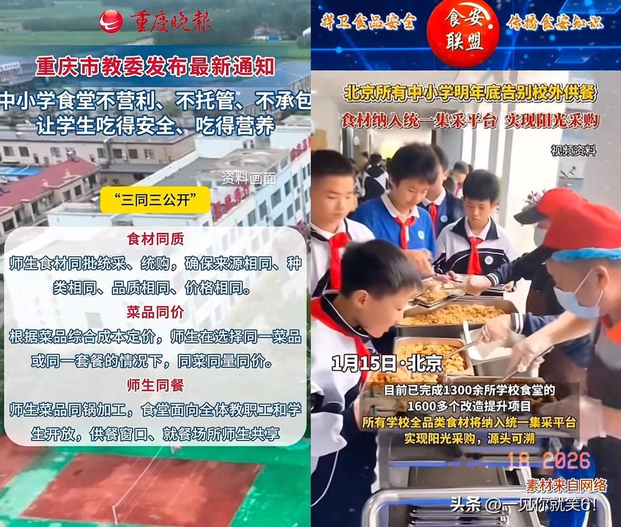 这消息一出, 宝妈圈估计要炸锅了。 刚刷到,重庆、北京两地中小学将收回食堂经营权。 规定各中小学必须自办食堂,食堂不得营利,不得承包,才能确保学生饮食营养和健康。 网友:这是为学生做的好事,应该在全国推广,为了食品安全,建议全体师生,包括校长,同吃一锅菜,同吃一锅饭! 也有网友说,还是学校自办食堂最好了,可以监督到位,还可以请家长参与其中,放心!你们有什么好的建议?