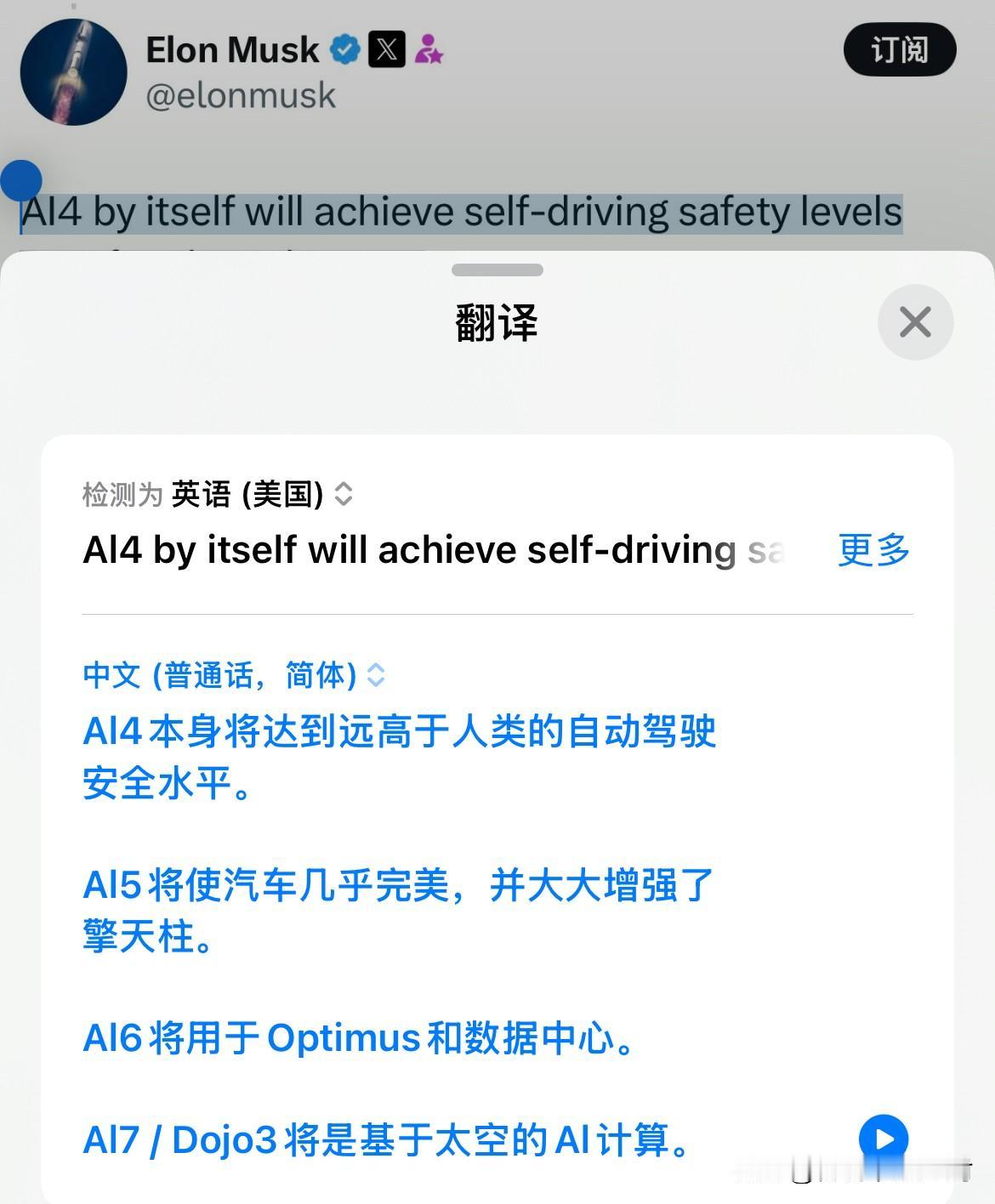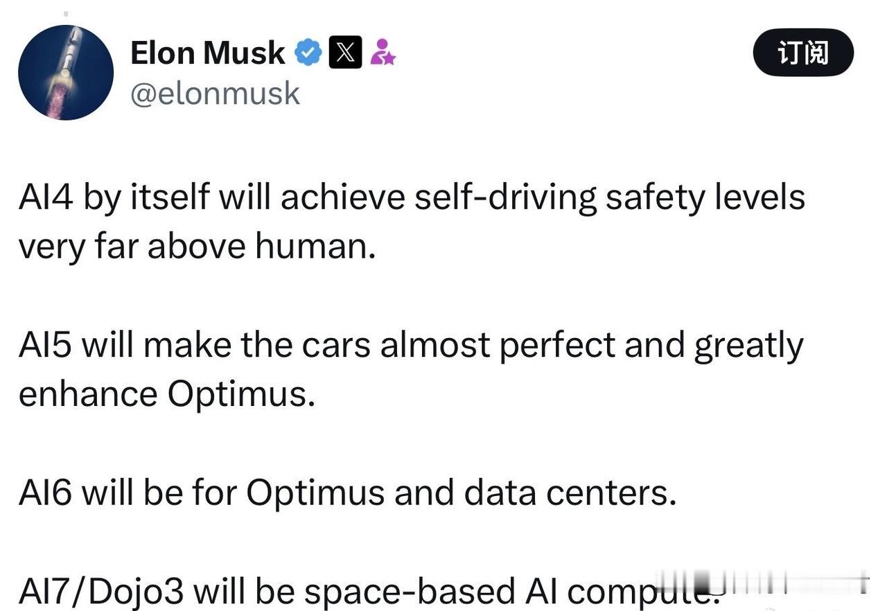马斯克解释了昨天的芯片布局。 原来AI6、AI7、AI8等芯片并不是为汽车准备的,而是为Optimus人形机器人、数据中心、甚至太空算力中心…… AI5对汽车来说,就已经完美了。 那这样说的话,考虑到马斯克昨天说AI5基本上已经设计完成,估计今年末,最迟明年初就有可能上车了。 那现在如果去买搭载AI4芯片的model 3或model Y并不算好的选择啊,况且现在也用不上FSD,干脆不如多等一年,然后一步到位直接上“接近完美”的AI5芯片。 岂不是更合适?