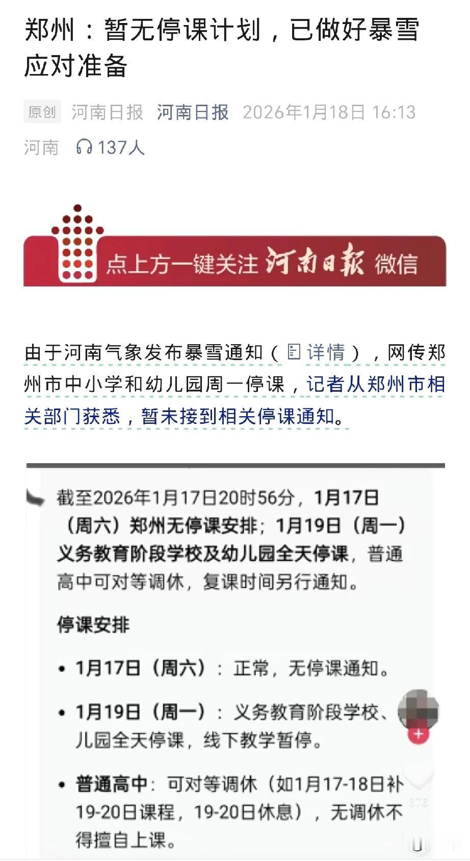 这次寒潮加大雪,郑州又做足了准备。 不少学校发停课通知了,大河报还报道了, 可是河南日报说无停课计划, 一时不知道到底停不停课了。