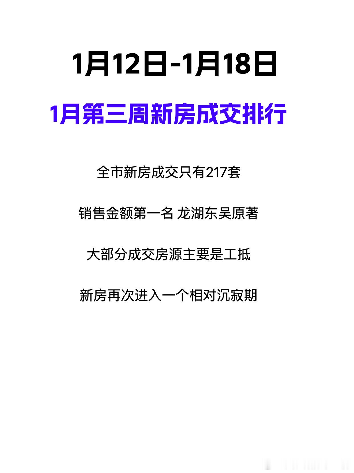 1月第三周新房无力在无力啊本周成交多数是工抵商的真工抵房转网签理由是很多项目都是现房很久的盘出现成交典型如星河盛世、龙湖启元、中南春风南岸等此外新项目如鸿湖上,建发璟园,绿城兴贤澜颂等保持每周都有网签但是整体新房市场很冷除了吴江七都的吴溇尚都雅院外上周全市无网签上二位数的项目成交数据