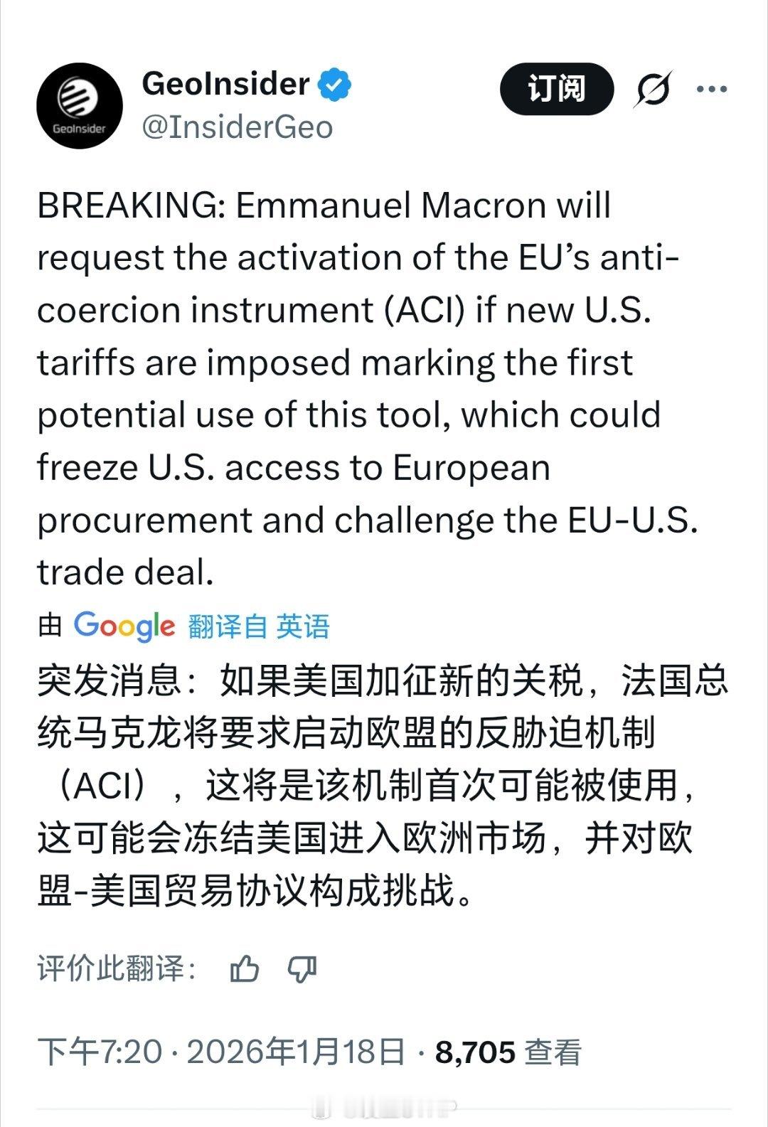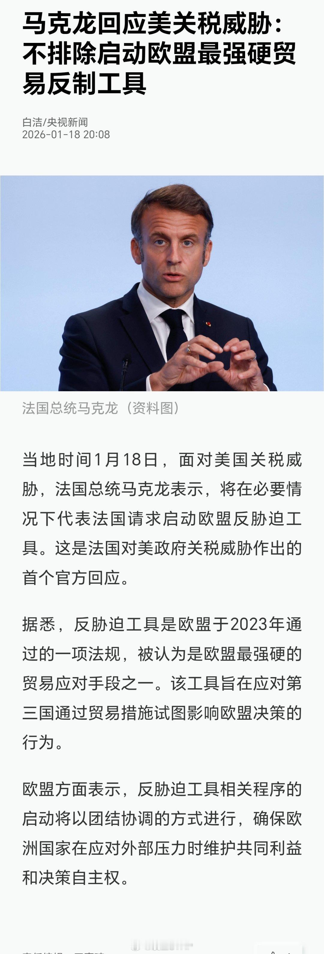 马克龙回应美国关税威胁马克龙回应美国关税威胁:不排除启动欧盟最强硬贸易反制工具