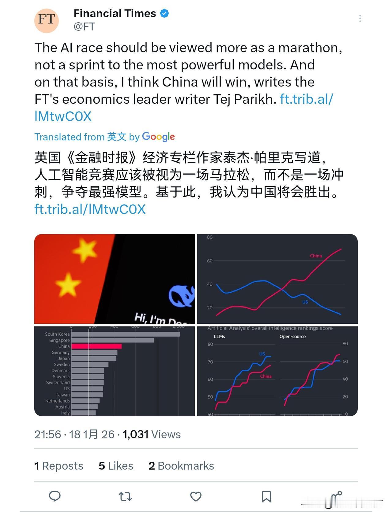 《金融时报》首席经济撰稿人泰杰·帕里克写道,人工智能竞赛应该被视为一场马拉松,而不是一场冲刺,目标是打造最强大的模型。基于此,我认为中国将会胜出。