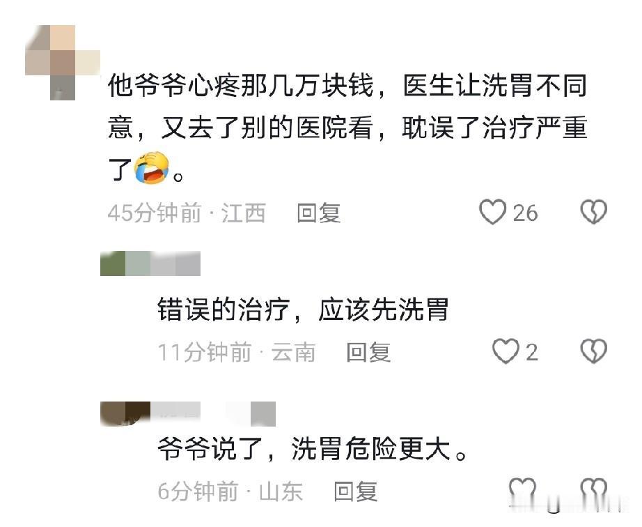 该洗胃,能抽出来一点是一点,这时候还管溶多少?就算是猪油缸子水涮涮也有用啊