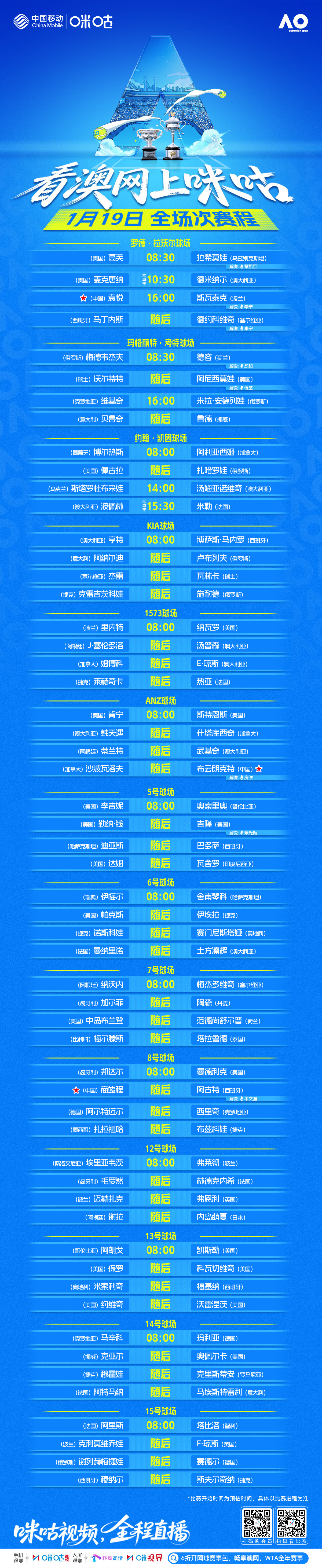 #上咪咕看澳网# 1月19日赛程💪 袁悦16点迎劲敌斯瓦泰克📸 商竣程、小布首轮亮相📺 1月18日8:00起 咪咕视频直播👉 网页链接