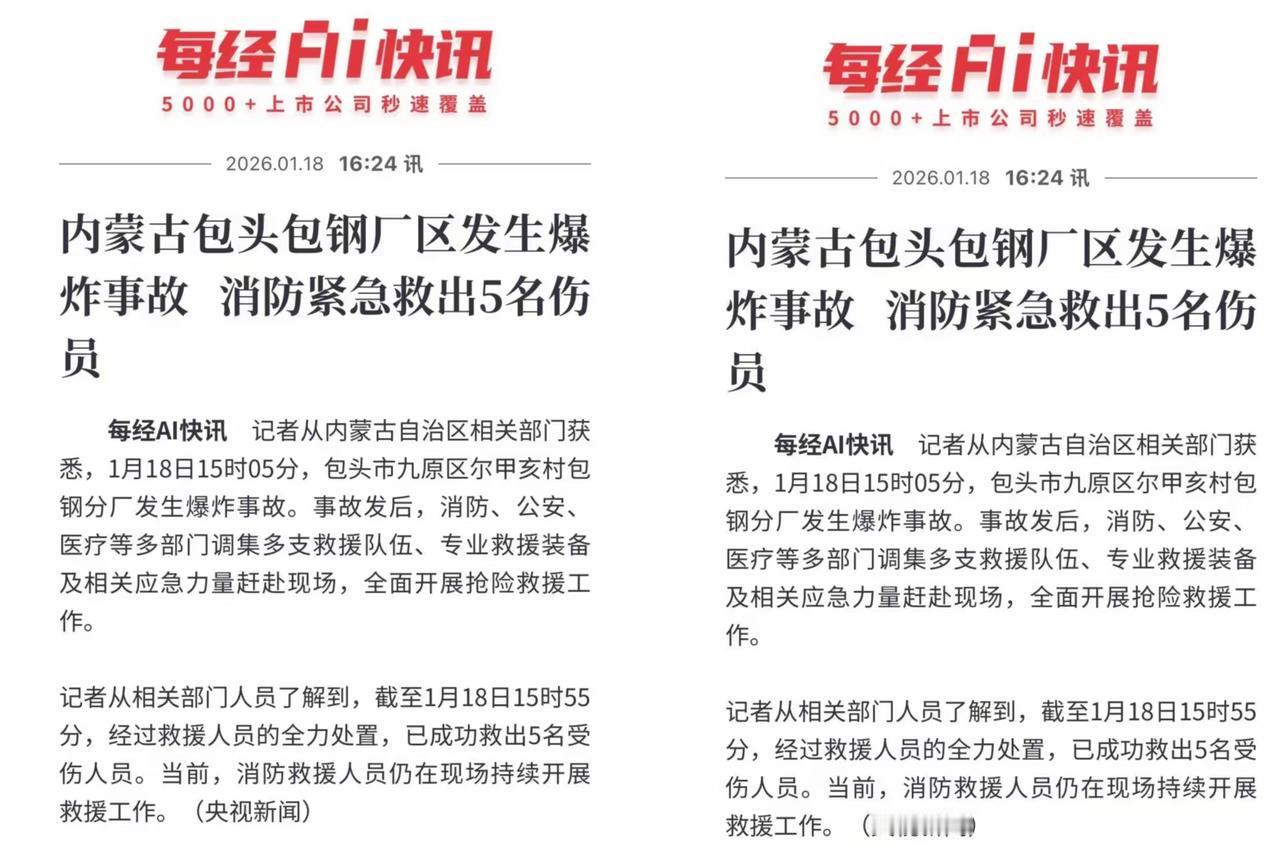 权威证实!2026年1月18日15时许,包头包钢一板材厂突发爆炸,巨响震彻全城,10公里外都有明显震感,不少居民家玻璃被震碎。 事故发生后,消防、公安、医疗等多支救援力量紧急驰援,医院开通绿色救援通道。截至目前,已致2人遇难、5人失联,66人送医救治,其中3人重症。自治区领导第一时间赶赴现场指导救援,严防次生灾害。 安全生产重如泰山,愿救援顺利,失联人员平安归来,盼事故原因早日查明,筑牢安全防线!