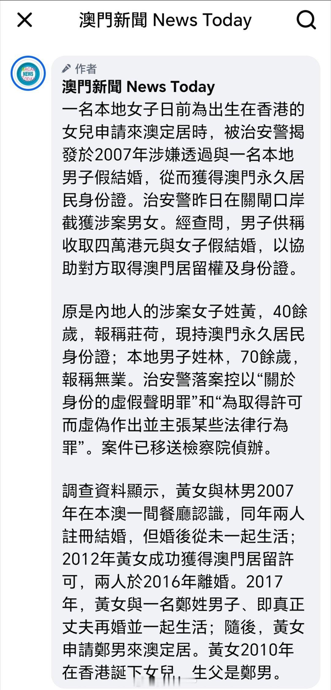 这个女滴太贪心,该女子为获取澳门身份证,与一名澳门男子假结婚。之后她前往香港,与真实丈夫生下女儿,并使女儿获得了香港身份证。待其本人取得澳门身份证后,便与假老公离婚,同时安排真实丈夫赴澳门定居。此后,她又试图为在香港出生的女儿申请澳门身份证,最终因之前假结婚的行为被警方查获,现已被拘留。女子为获澳门身份假结婚被拘