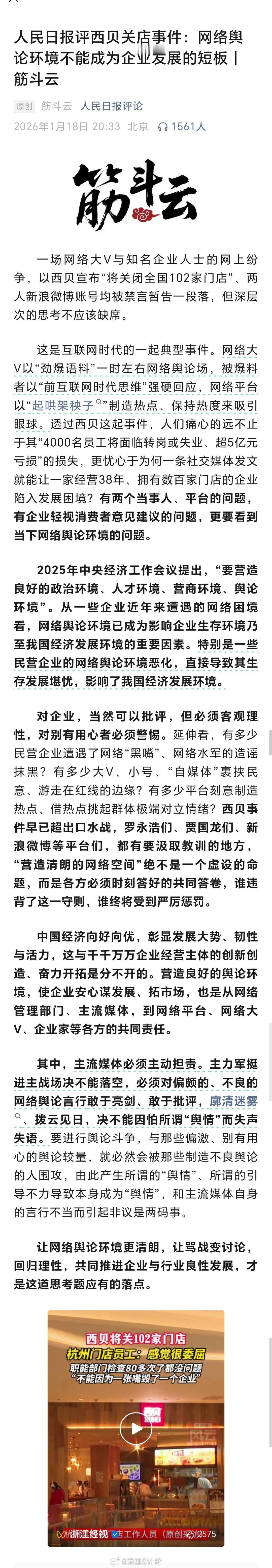 人民日报评西贝关店事件人民日报评西贝关店事件:网络舆论环境不能成为企业发展的短板文章呼吁各方共同承担责任,特别是主流媒体要敢于发声亮剑,推动网络空间清朗化,使舆论从非理性骂战回归理性讨论,最终为企业创造安心发展的良好环境,保障经济大局的稳定与活力。