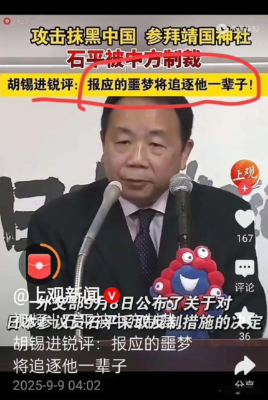 胡锡进点评著名汉奸石平:报应的噩梦将追逐他一辈子。事情每天生活在战战兢兢中,每天都是如履薄冰,他真的会害怕吗!迟早被报应而死!如果有勇士跑到日本把石平干掉了,算不算为国除害了呢,成为民族英雄呢!省的石平参拜靖国神厕、到台湾溜圈专门气人!