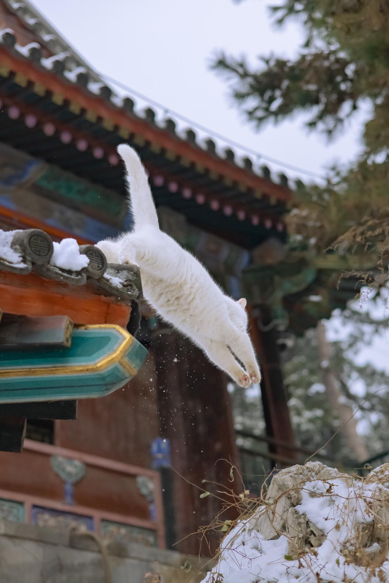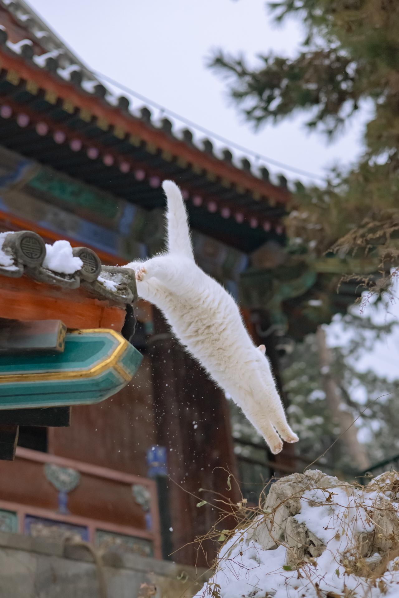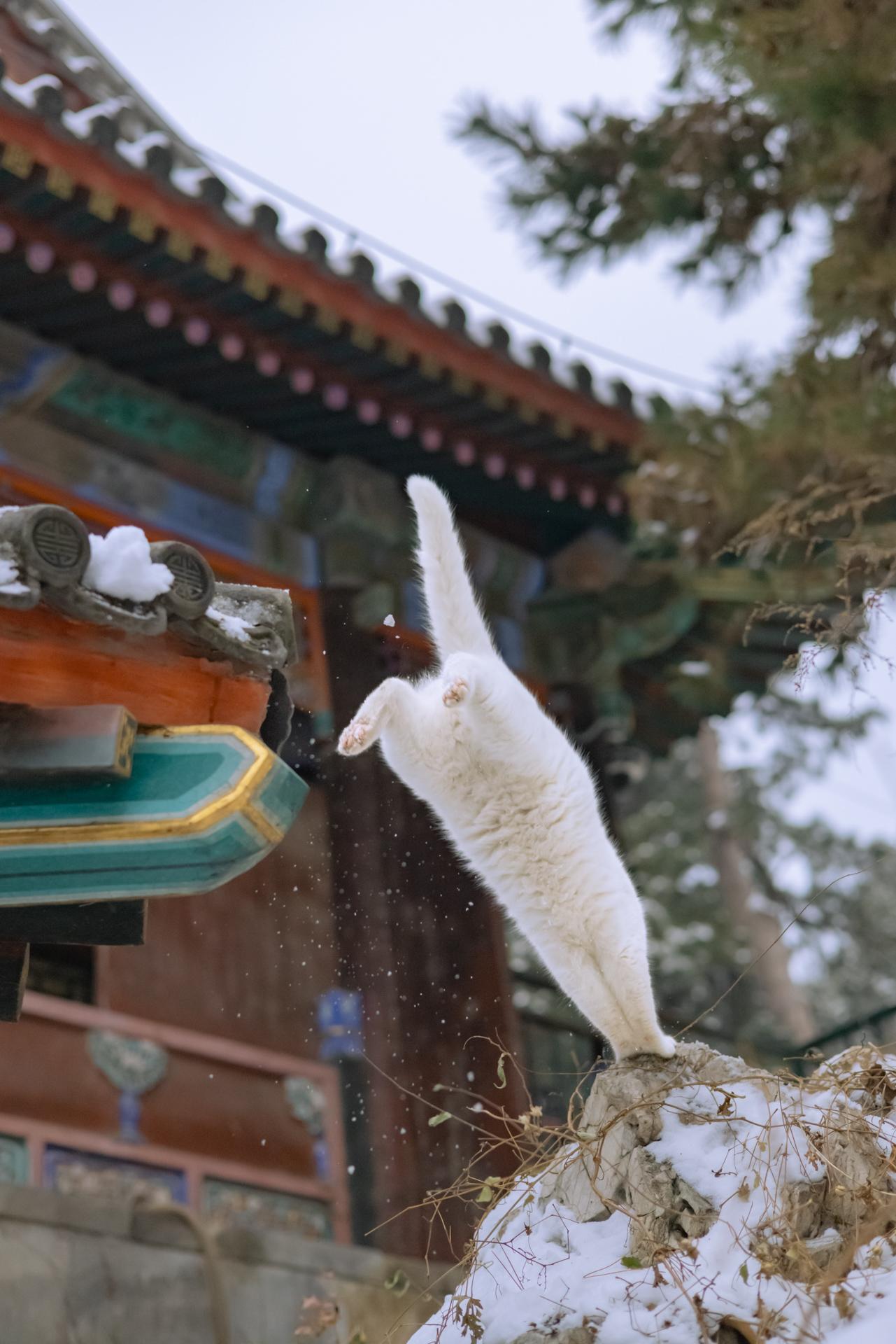雪天御园里,拍到了尺玉霄飞练。此刻白猫成了雪的化身,轻轻一跃,惊起雪花一片。