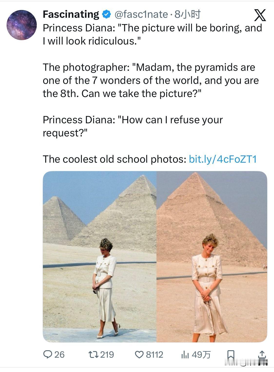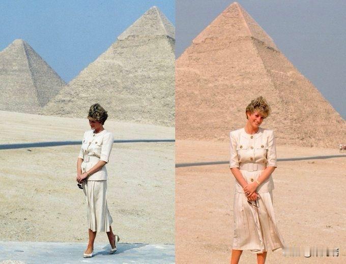 戴安娜王妃:“这张照片会很无聊,而且我会看起来很滑稽。” 摄影师:“女士,金字塔是世界七大奇迹之一,而您是第八大奇迹。我们可以拍照吗?” 戴安娜王妃:“我怎么能拒绝您的请求呢?” 戴安娜王妃穿着一套奶油色狩猎风格的凯瑟琳·沃克(Catherine Walker)套装。 最酷的老照片展示了戴安娜王妃(Princess Diana)1992年5月12日访问埃及吉萨金字塔时的标志性时刻。 这次访问是她对埃及进行为期五天正式访问的一部分。