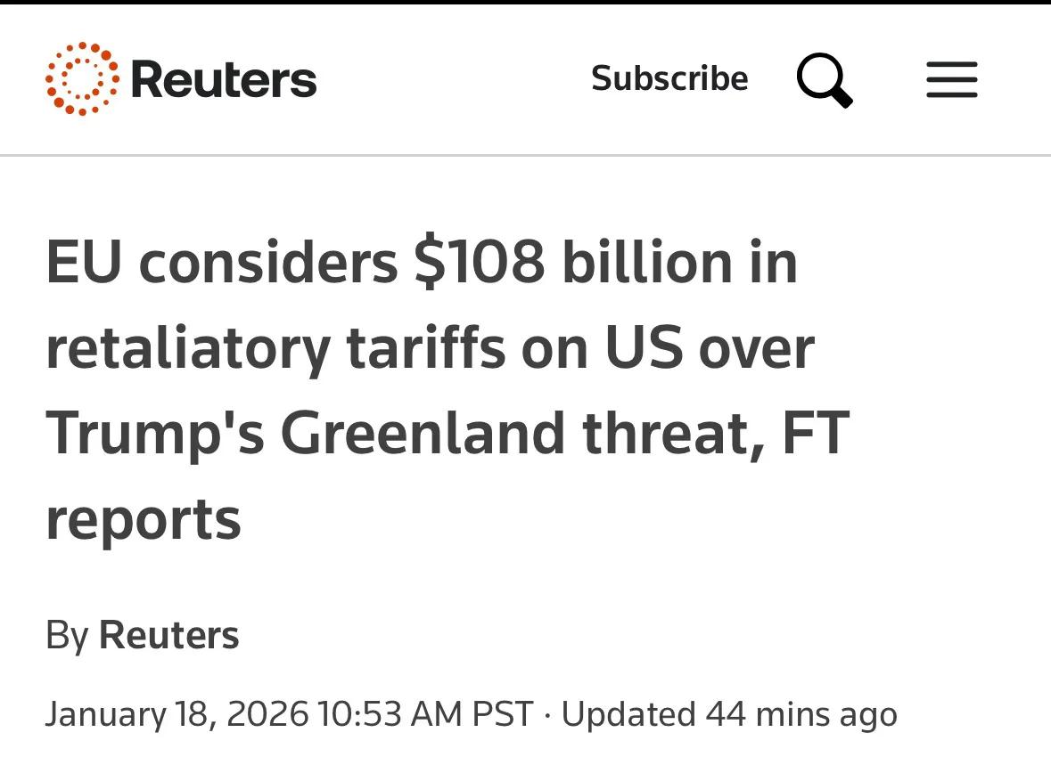 据《金融时报》,欧盟正准备对美国公司征收共约930亿欧元关税,并可能限制其进入欧盟市场,以此反击特朗普对格陵兰岛的威胁。 这两大集团还是挺有趣的: 北约里有美国,大家还在努力争取搞好内部团结; 欧盟就可以一致对付美国了。