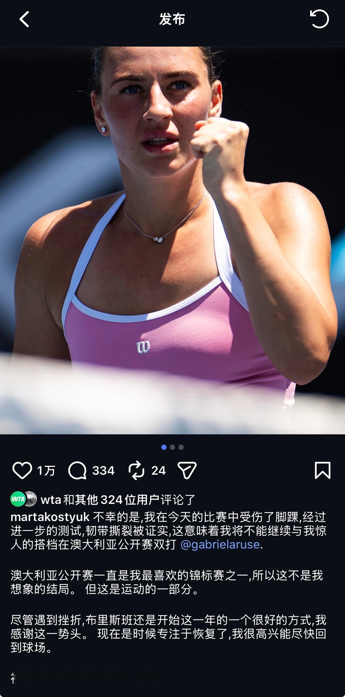 科斯秋克公布伤情,表示自己今天在比赛中是韧带撕裂伤,无法继续参加双打比赛。今天她和雅克莫的三个半小时大战,是公开赛年代澳网女单唯一的三抢七(十)大战。澳网2026