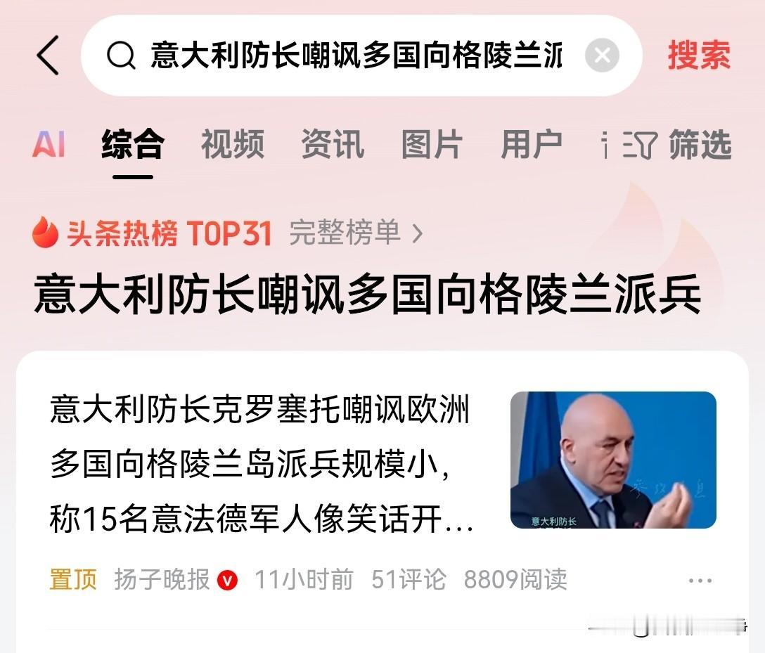 就在德国15人大军逃跑回国的同时,意大利国防部长正在嘲笑这次行动。 意大利防长克罗塞托,在接受媒体采访时公然调侃道。 我实在无法理解他们的存在,派15名法国人,15名德国人假如说再派15名意大利人。 跑到格陵兰岛上去开玩笑吗? 没带任何武器,也没有任何的军事基地,也没有任何作战目标,一枪不发。 这不就是开玩笑吗? 这完全就是一个笑话的开头。 其实欧洲到现在已经把自己活成了一个笑话。 假大虚空。 面对乌克兰,他们口口声声说要军援,但是现在基本上开的都是空头支票。 前二年,欧洲人还有点家底,倒是愿意掏出一些真金白银,还有武器装备来援助乌克兰。 但是到第3年之后,欧洲人就已经支援不动了。 他们大量的开空头支票,嘴上说援助多少个亿,实际上迟迟没有行动。 所以乌克兰的战局急转直下,库尔斯克战役是欧洲军团最后的一次尝试。 之后就彻底完蛋了。 现在又上来了一个特朗普,公开要抢丹麦王国的领土。 欧洲人没别的办法,只能接着演戏了。