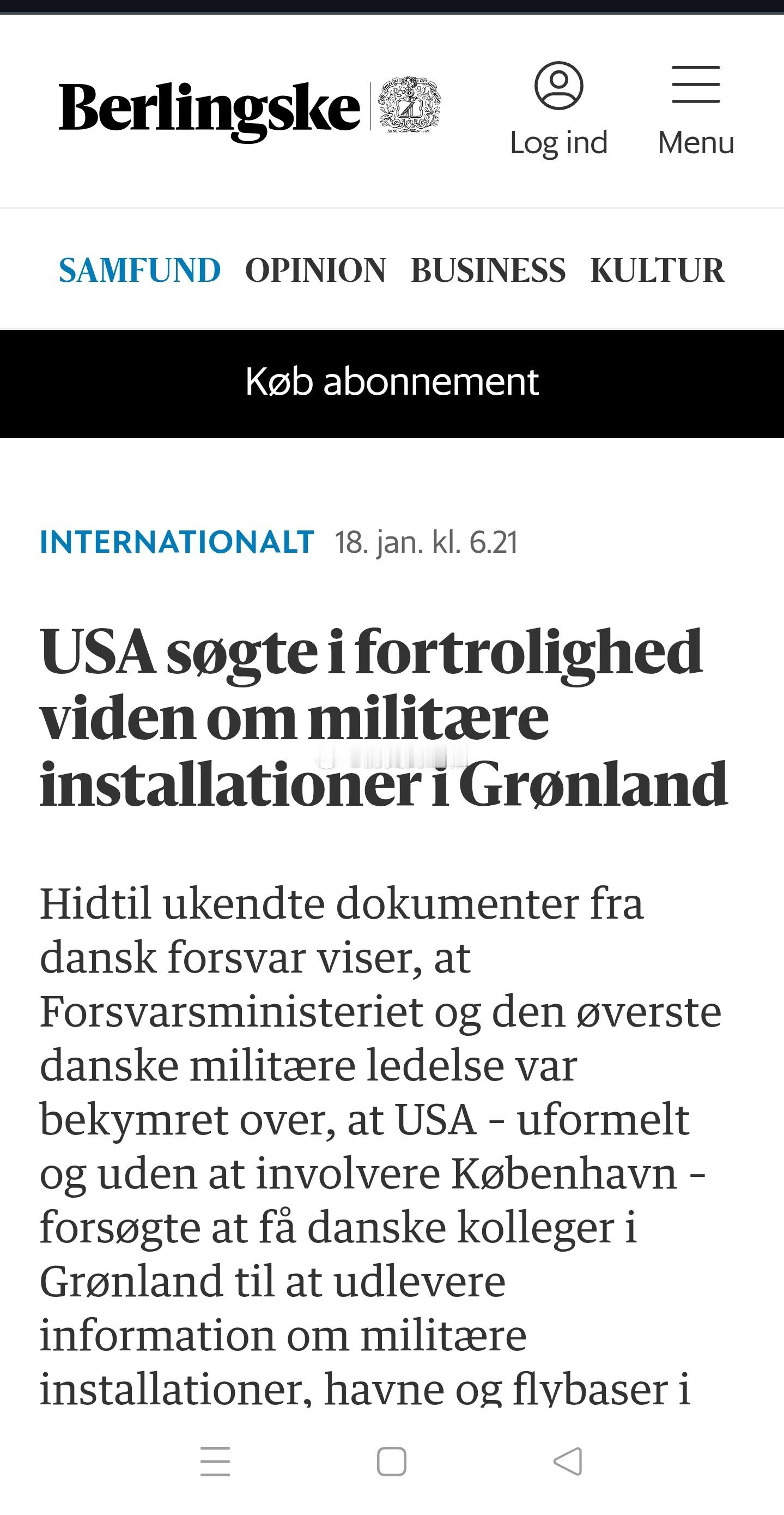 丹麦全国性日报Berlingske报道,丹麦国防部内部报告显示,美国军方高级官员在未通知哥本哈根的情况下,曾试图非正式地获取有关格陵兰岛军事设施、港口和空军基地的敏感信息。据该报援引官员的话报道,丹麦当局认为此举令人担忧。人们担心这可能与美国针对格陵兰岛施压甚至采取军事行动的应急计划有关。丹麦政府和军方领导层已立即获悉此事。专家警告官员,他们应该警惕美国对丹麦的间谍活动。 海外新鲜事