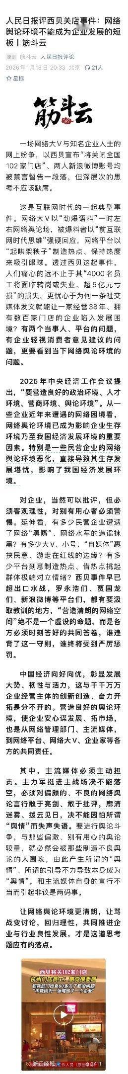 人民日报评西贝关店事件:一些民营企业的网络舆论环境恶化,直接导致其生存发展堪忧,