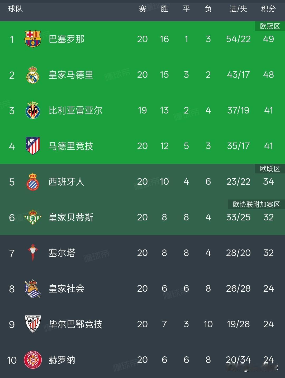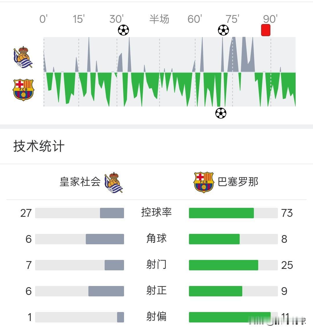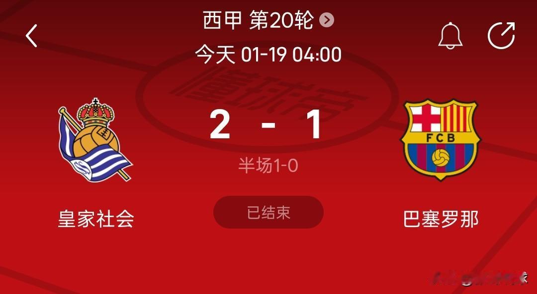 西甲积分榜丨巴塞罗那1-2爆冷输球各项赛事11连胜被终结,巴塞罗那只领先皇家马德里一分。 皇家社会2:1战胜巴塞罗那,巴塞罗那此前的11连胜被终结,巴萨积49分,皇马积48分,榜首之争很激烈。 巴萨占据七成以上控球率,全场狂轰25次射门,依然没能赢下比赛,皇家社会率先进球,巴萨刚扳平后又失球。