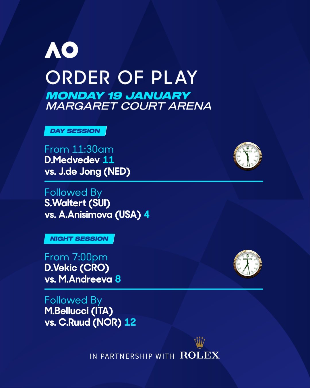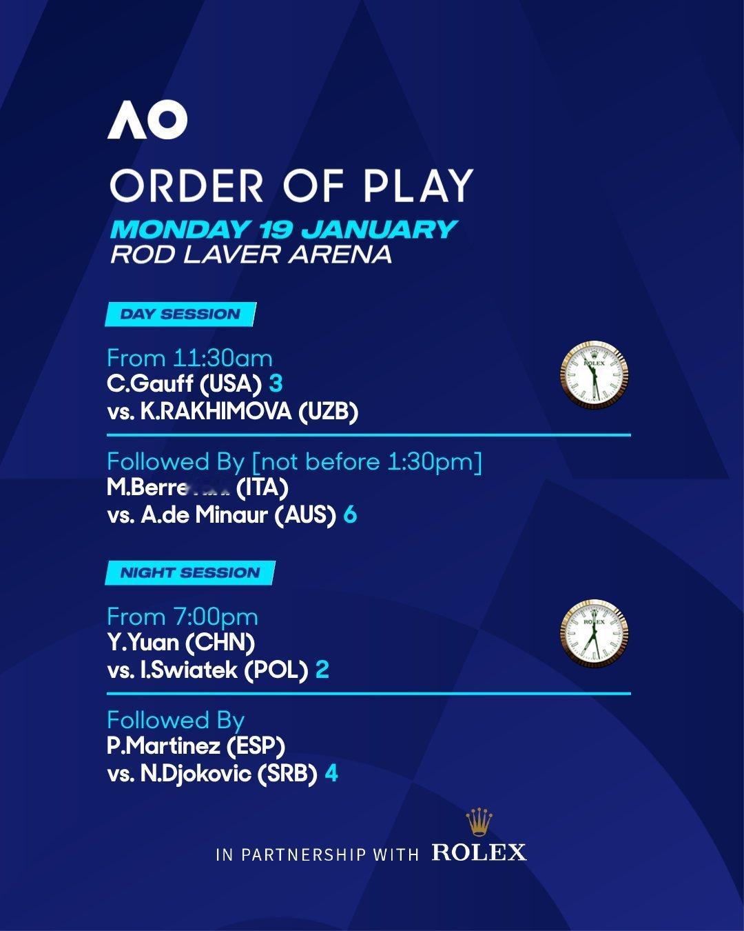 澳网2026 澳网第二比赛日(1月19日)两大中央球场的赛程安排:罗德拉沃尔球场(北京时间8:30开始)🇺🇸高芙vs拉希莫娃🇺🇿🇮🇹贝雷蒂尼vs德米纳尔🇦🇺🇨🇳袁悦vs斯维亚泰克🇵🇱🇪🇸马丁内斯vs德约科维奇🇷🇸玛格丽特-考特球场(北京时间8:30开始)🇷🇺梅德韦杰夫vs德容🇳🇱🇨🇭瓦尔特特vs阿尼西莫娃🇺🇸🇭🇷维基奇vs安德列娃🇷🇺🇮🇹贝鲁奇vs鲁德🇳🇴其他中国球员澳网第二日比赛赛程:8号球场第二场(大约10点):🇨🇳商竣程vs阿古特🇪🇸ANZ球场第四场(大约15点):🇨🇳布云朝克特vs沙波瓦洛夫🇨🇦这很澳网