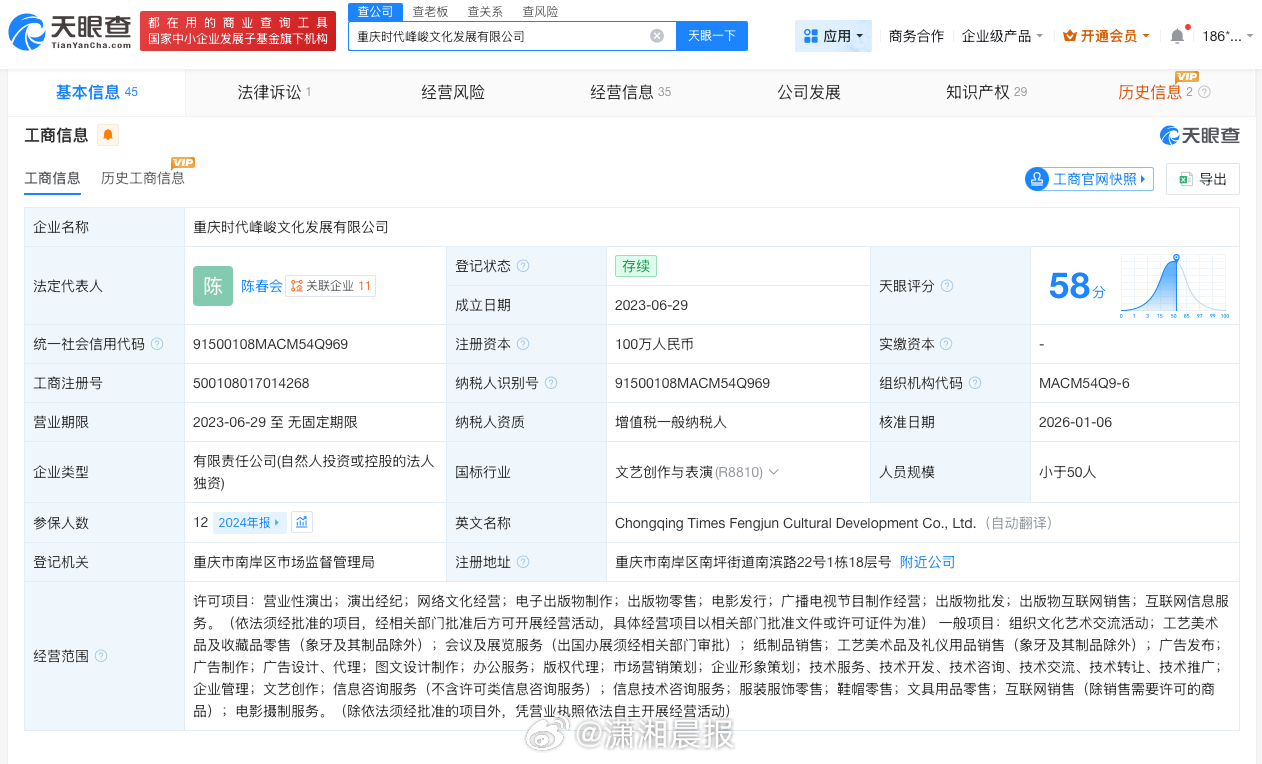 【#重庆时代峰峻新增营业性演出许可#】#重庆时代峰峻演出经纪机构设立获批#1月19日,记者查询天眼查App显示,近日,重庆时代峰峻文化发展有限公司新增一则行政许可信息,许可证书名称为重庆市营业性演出准予许可决定,许可内容为演出经纪机构设立,许可机关为市文化旅游委。重庆时代峰峻文化发展有限公司成立于2023年6月,法定代表人为陈春会,注册资本100万人民币,经营范围包括营业性演出、演出经纪、网络文化经营、电子出版物制作等,由北京时代峰峻文化艺术发展有限公司全资持股。