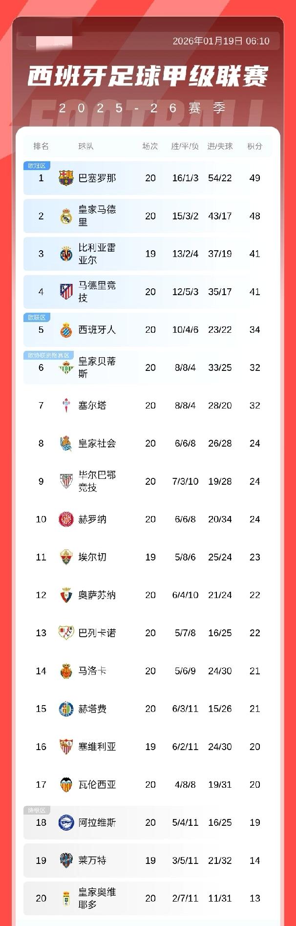 西甲积分榜:巴萨输球积49分仅1分领跑,皇马积48分第二,马竞41分第四 01月19日 西甲第20轮 皇家社会主场2-1战胜巴塞罗那 积分榜上,巴萨李49分仅1分领跑,皇马积48分第二,马竞41分第四,皇社24分第八