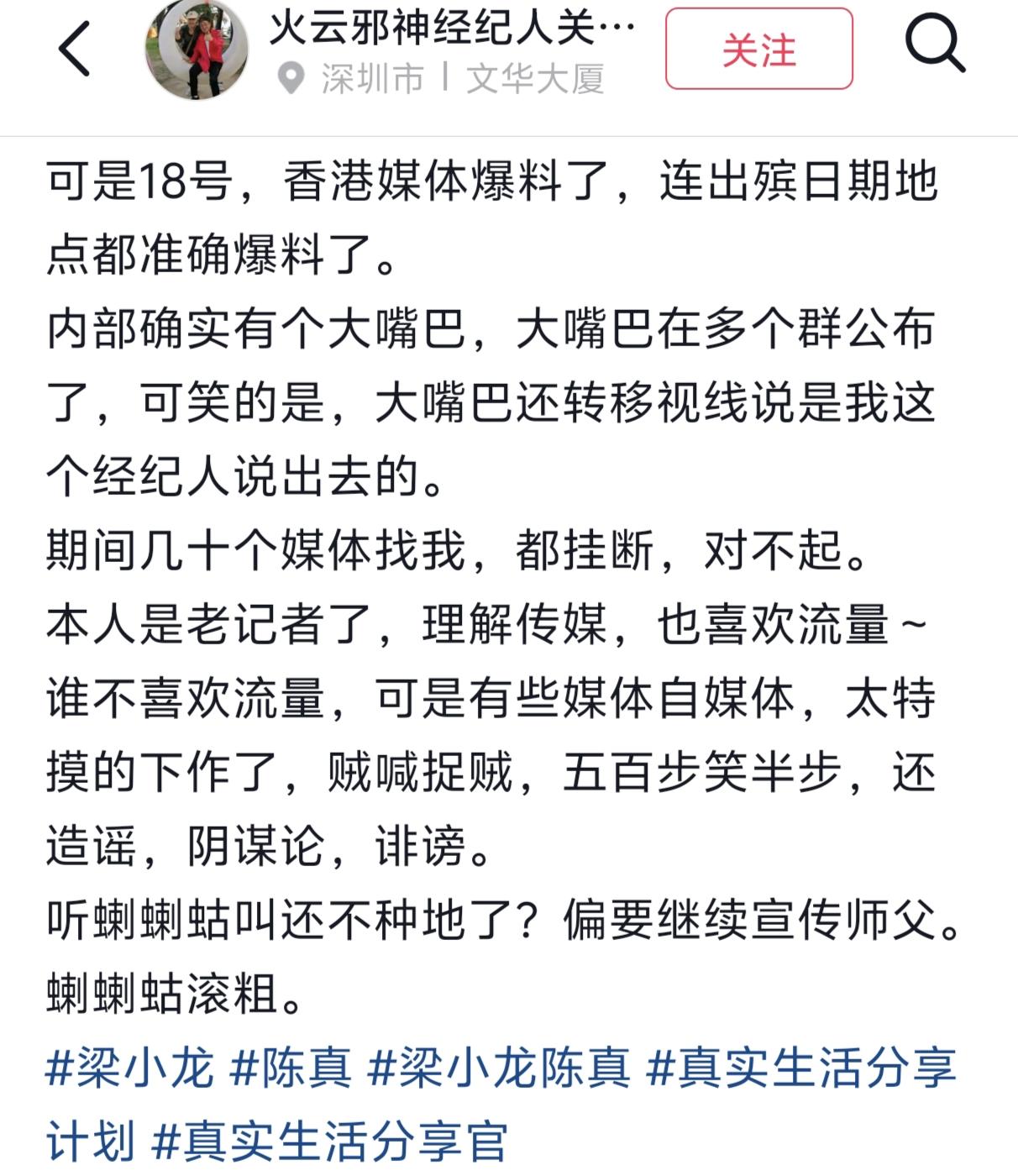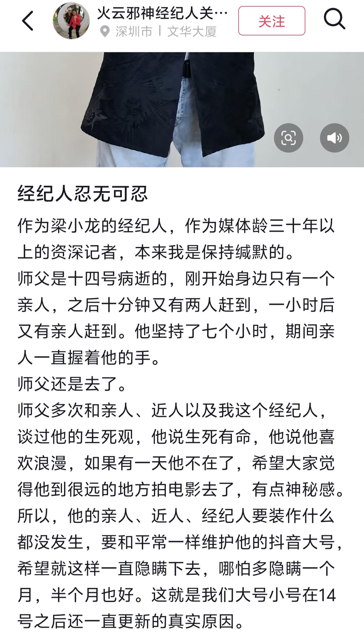 梁小龙经纪人透露梁小龙去世时的相关细节:梁小龙是14日病逝的,刚开始身边只有一个亲人,10分钟后又有两人赶到,1小时后又有亲人赶到,梁小龙坚持了7个小时,期间亲人一直握着他的手,但最后还是去了。 还透露梁小龙多次和亲人、近人以经纪人,谈过他的生死观,他说生死有命,他喜欢浪漫,如果有一天他不在了,希望大家觉得他到很远的地方拍电影去了,有点神秘感。 所以,梁小龙身边的近人都装作什么也没发生,和平常一样维护他的抖音大号,希望就这样一直隐瞒下去,哪怕多隐瞒一个月,半个月也好。 这也是梁小龙大号小号在14日之后还一直更新的真实原因。 可是18日,香港媒体爆料了,连出殡日期地点都准确爆料了,梁小龙的经纪人也表示很无奈。 作为一个 80后,当年的陈真、霍元甲陪伴了我的整个童年时光!看到他的账号每天都在更新着视频,多么希望这是一个假消息,多么希望他会亲自出来辟谣说那是诋毁那是诽谤! 可是,我知道他离开了却也没有离开,真正的离开是世人忘记他,我想会有很多很多人一直记得他!