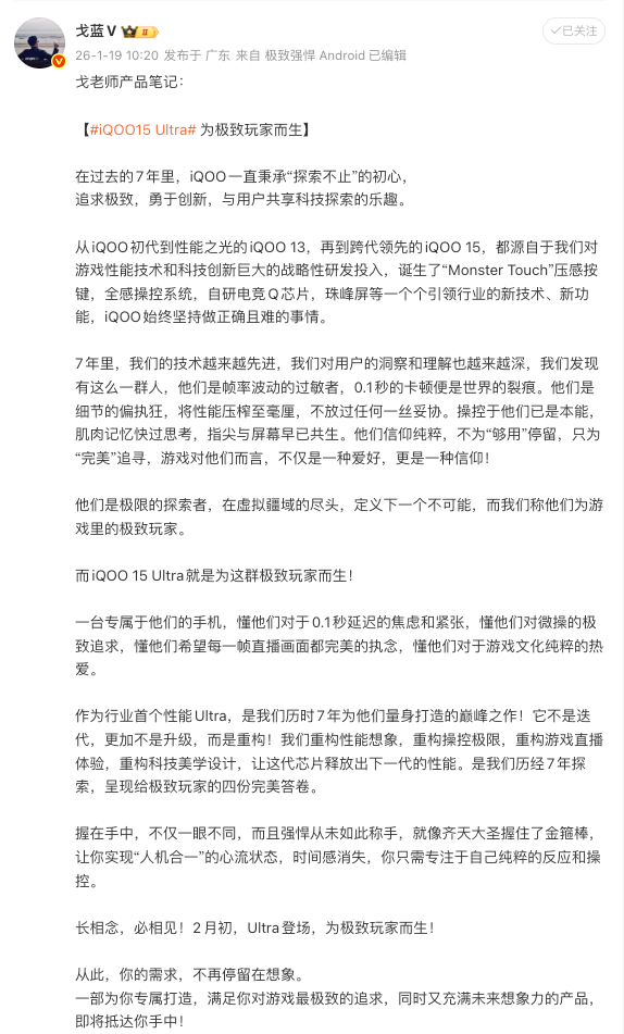 戈蓝我信你!极致玩家绝对值得关注的一款超级性能旗舰机!主动散热风扇和肩键不用多讲了!就看最强性能能做到多强了!可以说是iQOO自品牌成立以来的集大成者,要是做的不满意我连夜坐火车找戈蓝去!
