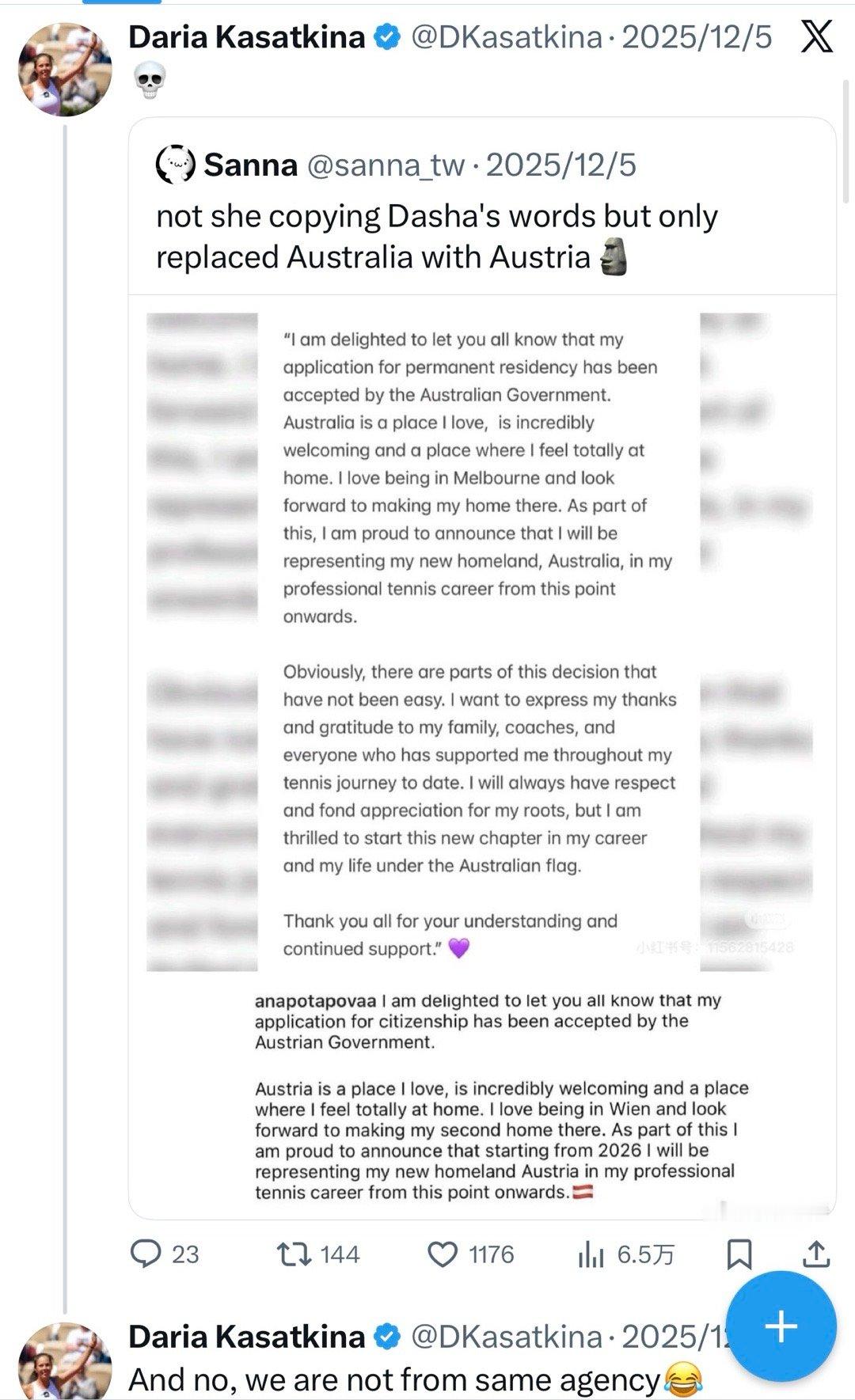 去年波塔波娃转奥地利国籍的时候,发布的声明完全抄袭卡萨金娜转澳大利亚国籍的声明(只是替换了奥地利)。结果还被卡萨金娜本人转发出来。昨天波塔波娃在澳网2026 首轮大逆转拉蒙斯后,被问及此事。她倒是很大方回应:“我不觉得这有什么不妥。因为那段文字的表达已经足够完美了,换种说法未必能更好。既然如此,借鉴一下又何妨呢?那段文字真的写得很棒,我非常喜欢。我和我的团队,还有身边所有人都很认可。所以我们就决定引用试试。我不觉得这是什么大不了的事,反而是这件事被媒体大肆炒作,只是因为他们本来就不乐见我做出这样的表态。而且说到底就是几条社交媒体帖子而已,有谁会真的在意呢?”