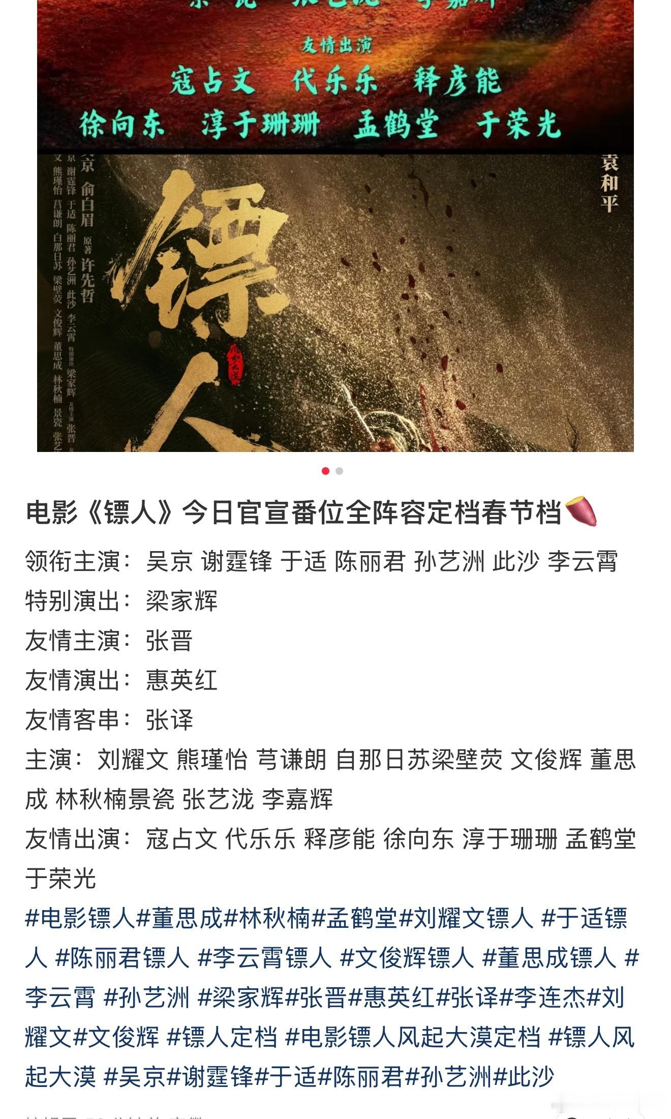今天一看热搜上八百个电影镖人的词条宣传,电影镖人定档春节、镖人预告片公布、于适镖人灰白长发、刘耀文镖人预告、陈丽君李云霄合作镖人……那是劈天盖地的预热,赶紧去看了一下演员表,好家伙了,全明星阵容啊,有实力派演员,又有流量小生这种狂砸阵容的大概率,以我多年看电影的经验来说,并不会好看。票房问题我觉得倒不用担心,毕竟他们的粉丝自来水去看,这票房就不会低的。先别急着喷我,真人版从选角开始就已经有太多问题了,喜欢漫画版的,我建议放弃对还原漫画的幻想,当成套皮电影看就行了。因为漫画的画风在国内确实是独一档,可惜更新太慢了导致整体内容有点薄,IP开发的也不是很好,所以动画和电影感觉都不会很叫座,感觉最后就靠演员自带的流量拉拉票房了。(为了防止有粉丝喷我,我答应你们,到时候我会买一张电影票支持一下的