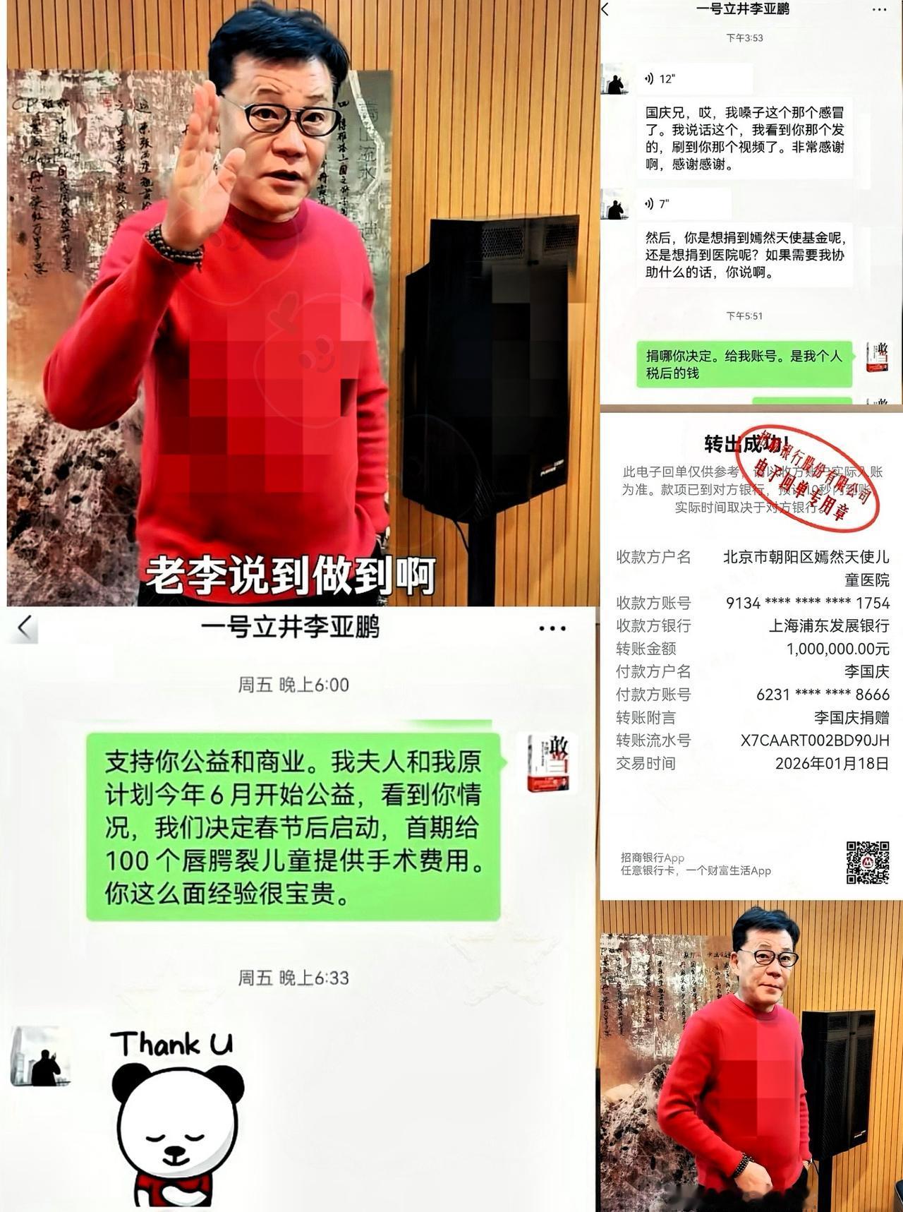 李国庆向嫣然儿童医院捐了100万! 最有意思的不是这笔钱,而是李亚鹏问他这100万想怎么花时,李国庆的回话。 这哪是捐款,分明是两个摔过跟头的中年男人,心照不宣的江湖默契。一个曾因离婚大战摔杯出圈,一个被债务缠身后仍守着公益初心,他俩都不是世俗意义的“完美者”,却最懂彼此的坚持与不易。 李国庆捐的是个人税后收入,晒出的转账单比任何话术都有力量;李亚鹏谨慎询问用途,是历经风波后的清醒。没有套路,没有提防,纯粹是人对人的信任,比千万句漂亮话都动人。 原来成年人最高级的共情,从不是锦上添花,而是见过对方的狼狈后,依然愿意递出真心。你觉得这份“懂彼此”的信任,在当下有多难得?李国庆