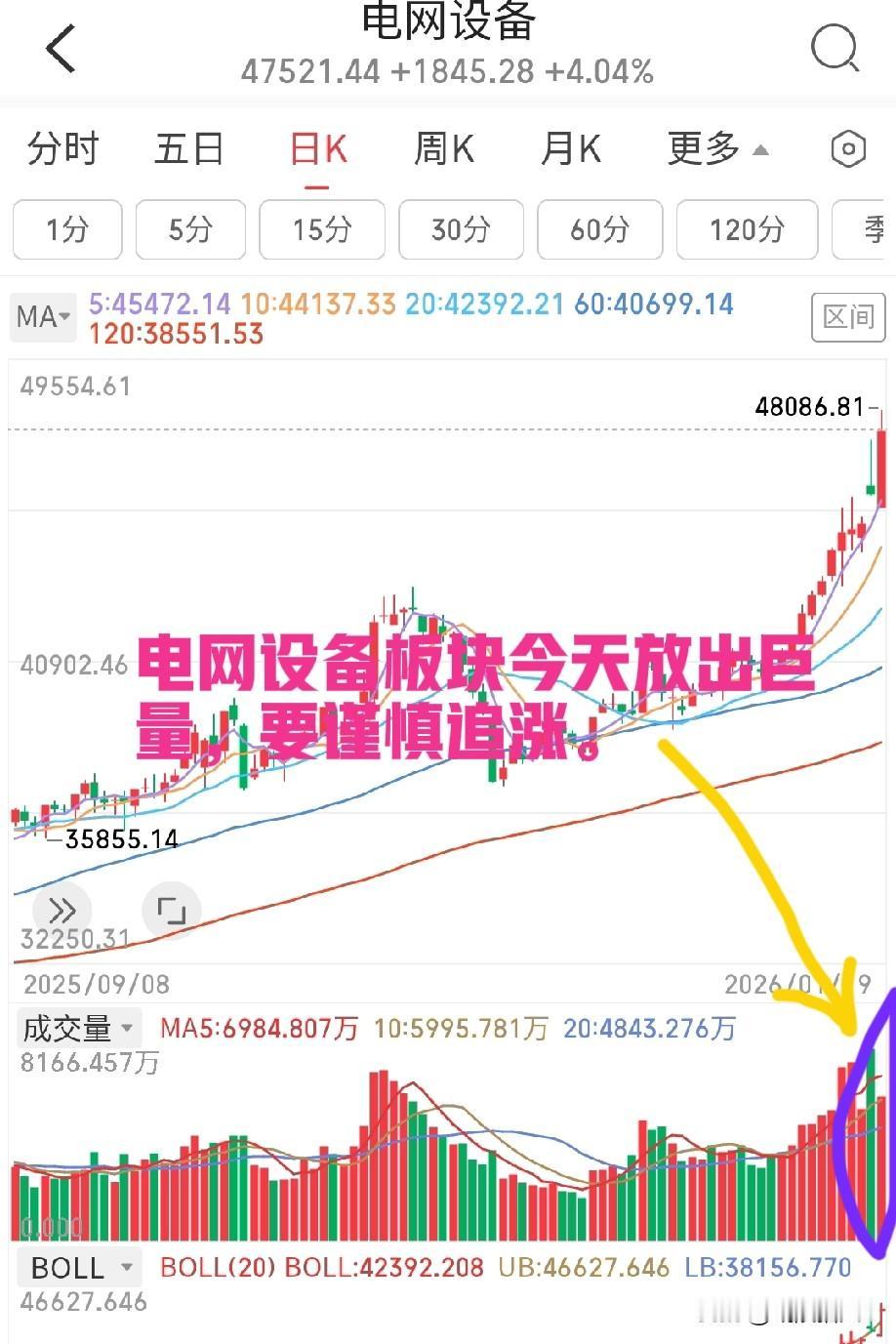 1月19日午评。两市上午涨跌不一,沪强深弱,多空分歧较大,指数呈震荡走势,行情比较纠结。 沪强深弱是因为前期深市和双创板块涨得较多,高位标股正在不断调整中。而沪市的大盘蓝筹大盘经过前几天的调整相对估值合理,加上这阵子管理层强调价值投资,所以资金有转移至低位股的趋势,市场正在进行一轮高低切换。 受消息影响,今日有色金属出现调整,但贵金属和小金属走得比较强势。总体而言,资源来大宗商品的涨价逻辑依旧存在。 今天商业航天板块出现反弹,但反弹力度不大,相对于前期的巨大涨幅而言,毗陵猎人认为这是下跌途中的反抽,多观望,少参与。 但是电网设备今天的强势上涨出乎我的预料,高位之后放出天量的上涨走势(图2),追进去是要有胆魄的,从防备风险的角度考虑,本人还是提倡低位吸筹等待拉升而不是去追高。现在这种行情,波诡云谲,谁也说不准后期大盘如何选择方向,现在在市场中赚每一分钱都要有火中取栗的思想意识。 预计下午,指数依旧以震荡为主,我们要做到的就是选准板块,抓住高低切换的市场风格,买卖都要有一个理性的价值评估,市盈率低的优质大盘蓝筹该涨一定会涨,而高标小盘股该调整一定还会调整。 个人观点,不构成投资依据,不喜勿喷。祝大家下午好运。