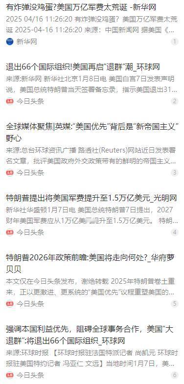 摊牌的时刻,已经到了!一夜之间,特朗普连发五道金牌,直接把“中美博弈”的遮羞布撕得粉碎!一边狂退66个国际组织,甩掉所有“义务”;一边狂砸1.5万亿美元军费,磨快手里的“屠刀”。这根本不是什么“让美国再次伟大”,这是在向全世界宣告:以前的美国要钱,现在的美国,要命! 麻烦看官老爷们右上角点击一下“关注”,既方便您进行讨论和分享,又能给您带来不一样的参与感,感谢您的支持! 先来看这退群的操作,66个国际组织,一个不落地甩掉。联合国机构、气候协定、经济合作联盟……你想得到的能站台的国际组织,这边特朗普全给退了。 这个动作很直白:以前美国玩的是“规矩和协议”,你听好了,是规矩和协议,背后是钱和影响力双管齐下。 退了以后,就是告诉全世界:“我不欠你们义务,也不听你们指挥,我说一不二。”说白了,这是彻头彻尾的单边主义,而且带点“霸气外露”的意思。 但别以为这只是嘴上说说,特朗普手里的“屠刀”也没闲着。1.5万亿美元军费,不夸张,你没看错,这数字真的大到令人发毛。 美军的口袋里有了足够的子弹、飞机、航母,甚至可以说是全球谁都得小心点。以前美国靠制度和规则影响世界,现在美国靠实力说话,明晃晃的拳头甩在全世界面前。 讲真,这种画面有点像小时候学校里那个最爱耍威风的大个子,明明作业没做好,但一喊就没人敢惹他。 这套操作看上去声势浩大,真是让人一边鼓掌一边紧张。短期内效果很明显:全球紧张感上升,大家都在揣摩美国下一步动作,股市、汇率、国际关系,几乎全场震动。 那些原本习惯美国“规矩游戏”的国家瞬间慌了神,因为你想象不到接下来会发生什么,规则被甩掉,实力说了算。 当然,这里有个不得不说的现实问题:国内情况。疯狂扩军、退出组织,成本不是小数目,背后都是美国纳税人的钱和压力。 1.5万亿美元军费不是从天上掉下来的,医疗、教育、基础设施、民生项目……本来就捉襟见肘,现在军费直接把预算挤到极致。 你想想,美国民众的日常生活还得面对高物价、高医疗、高房价,这套操作无异于“边吹牛边烧钱”。短期内的声势拉满,但民生困境也在同步加剧。 而国际层面,这种玩法有意思又尴尬。你别忘了,美国以前是“规则制定者”,靠各种协议和联盟维系霸权。 现在规则不在了,靠实力说话,很爽是爽,但孤立感也蹭蹭往上升。全球原本有美国撑腰的平衡机制,现在突然被撕开了一个大口子。 中国、俄罗斯、欧洲、日本……各方都在快速调整战略,毕竟不再有“你得听美国的规矩”,而是“你得看我拳头够不够硬”。这种变化短期内制造压力,长期来看,很可能让美国原本的盟友越来越心生距离感。 更关键的是,这种单边主义让“信誉”掉价了。以前美国说的话,你可以参考,至少有个规则框架,哪怕背后是利益考量;现在说的话,你得随时准备翻车。 你信不信,这套操作一旦持续下去,别人再提合作和协议,美国的信用值会越来越低,别人跟你玩的是实力博弈,而不是心照不宣的规矩游戏。 再说回特朗普的心态,简单总结就是:以前美国要钱,现在美国要命。要钱的时候,美国是讲规矩、讲合作、讲联盟;要命的时候,美国直接用拳头解决问题。 你要问这套操作能持续多久?这就看国际社会和国内压力有多大。短期内,能震慑不少人,国际舆论哗啦啦一片,美国的威慑力被无限放大。 但长期来看,孤立感、民生困境、国际信任下降,这些都是很现实的“后遗症”,不是几条金牌能解决的。 说白了,美国这套操作是一场短期震撼+长期潜在风险的大戏。短期内,他把“中美博弈”的面纱撕掉,亮出了硬核拳头;长期来看,美国的盟友和全球秩序都在重新洗牌,国内民生压力也被放大。 想让世界继续信赖、愿意合作?短期内可能很难了。想让老百姓觉得日子好过?更难。特朗普用行动告诉所有人:美国不再只是规则制定者,它是一个拿实力说话的巨型拳头。 只是,这拳头打出去的每一拳,背后都带着代价,全球紧张感上升,国内民生紧张,国际信誉缩水。 最终你会发现,这场“摊牌”既刺激又危险。刺激的是,全世界都在关注美国下一步动作,像看大片一样;危险的是,每一条金牌背后,都是巨大的不确定性,像一颗颗定时炸弹。 特朗普想要的是短期震撼和硬核形象,但代价注定会慢慢显现,民生、孤立、信任,这三座大山压下来,可没那么轻松。 所以,如果你问,这波操作算不算“让美国再次伟大”?答案很简单:短期震撼感拉满,长远风险也拉满。 美国在告诉全世界:以后我不讲规矩,我讲实力。但全世界也在暗暗嘀咕:这拳头打得响,但能撑多久?老百姓的钱包和全球信任,才是最真实的考验。