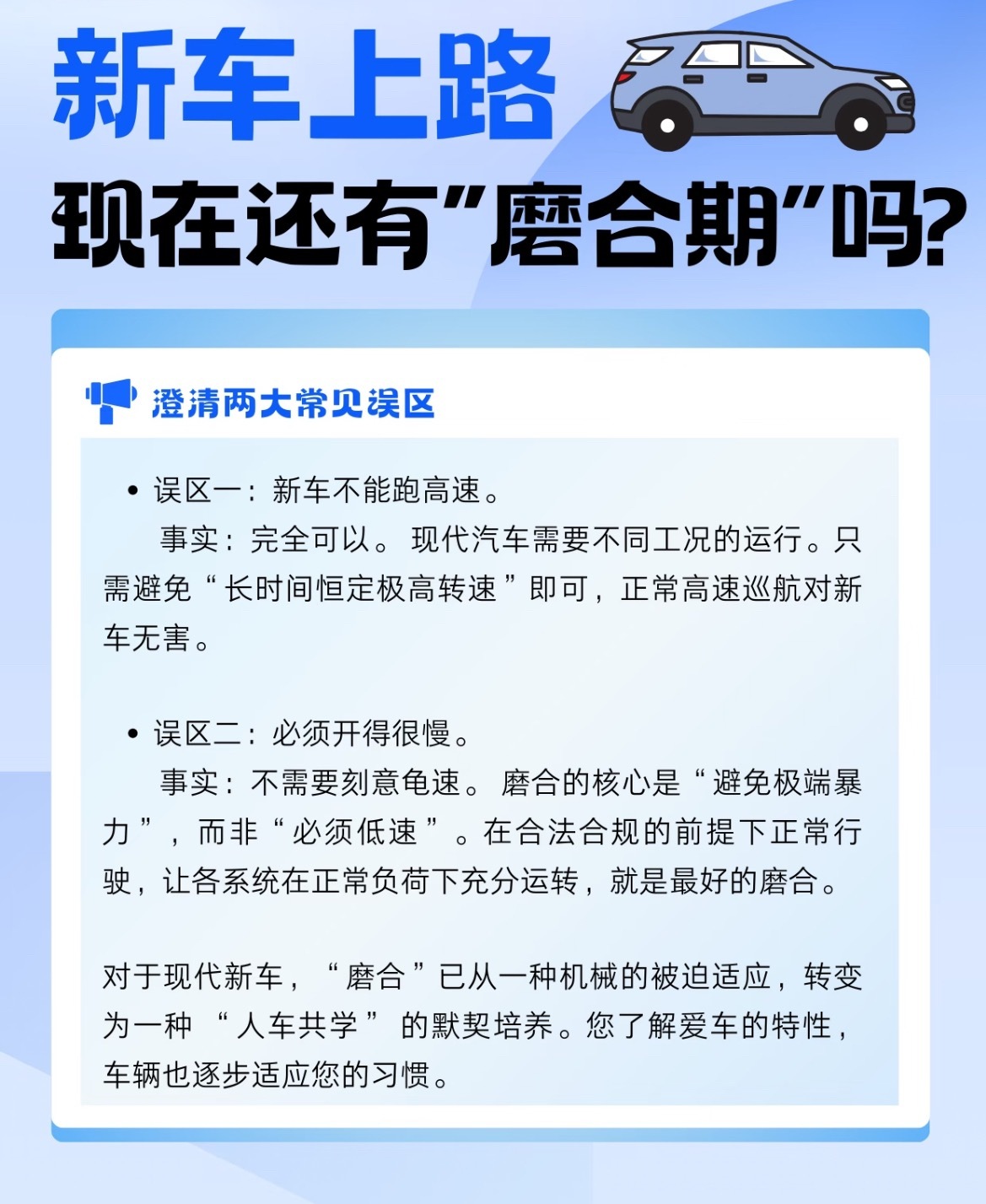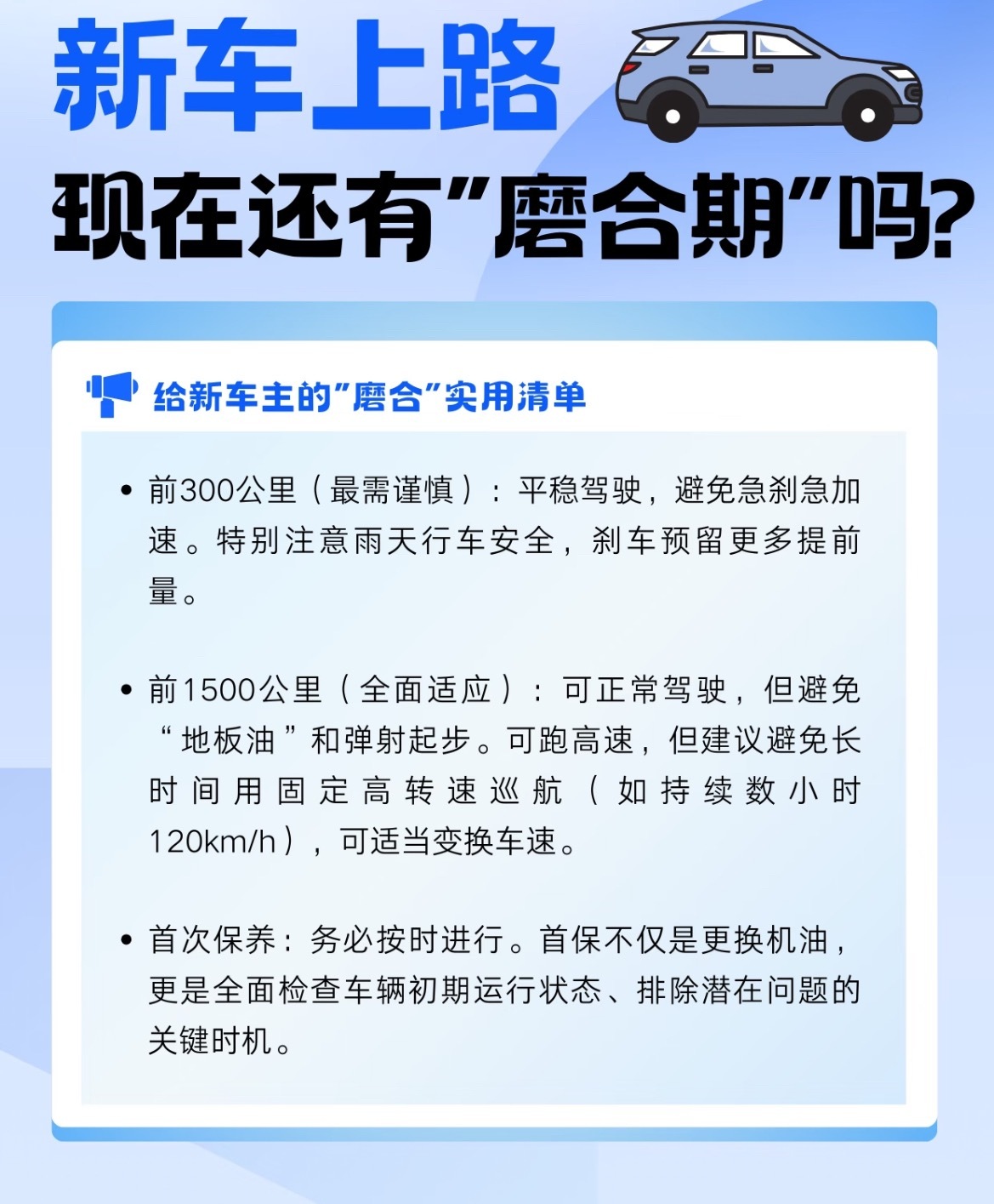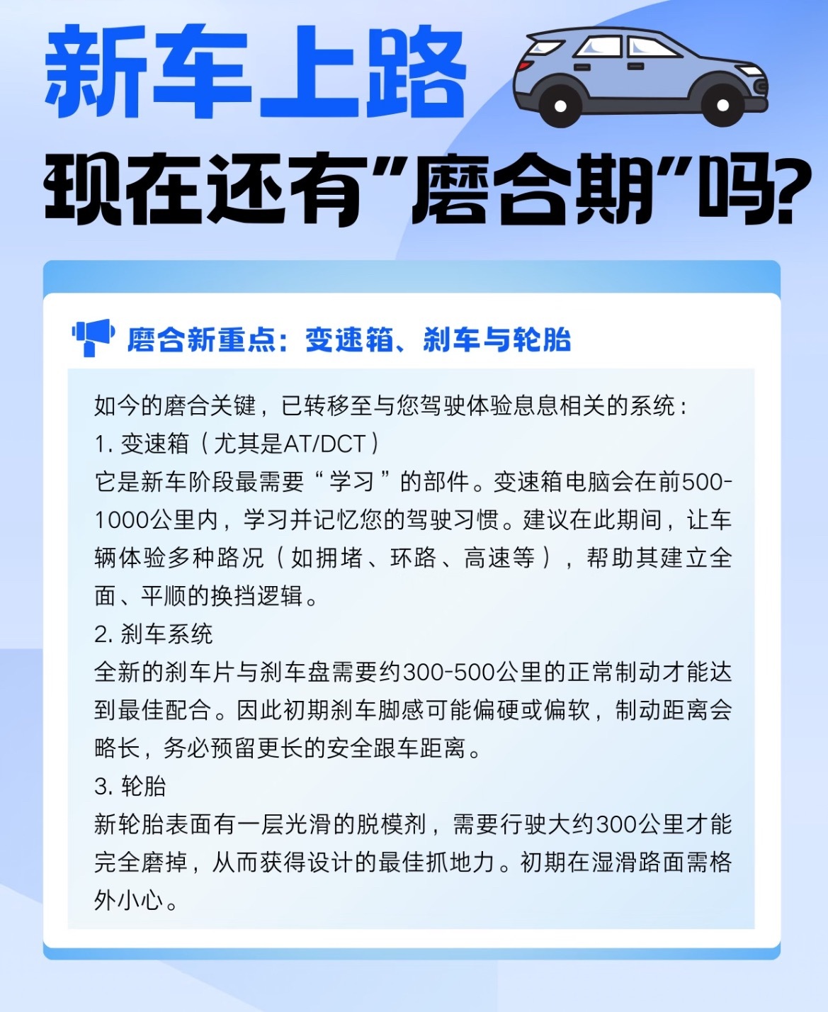 新车到手,到底还要不要“磨合”?别听老一辈说的那么玄乎,现代汽车的磨合重点已经变了🚗🔄 磨合新重点其实是这三个:1️⃣ 变速箱:尤其是AT/DCT,前500-1000公里会学习你的驾驶习惯。多跑不同路况(堵车、高速、环路),让它建立平顺的换挡逻辑。2️⃣ 刹车系统:新刹车片和盘需要300-500公里才能达到最佳配合。初期刹车脚感可能偏硬偏软,预留更长的跟车距离。3️⃣ 新轮胎:表面有脱模剂,前300公里抓地力未达最佳,湿滑路面要格外小心。📋 新车磨合实用清单:1️⃣前300公里:平稳驾驶,避免急刹急加速2️⃣前1500公里:可正常开可跑高速,避免弹射起步和长时间固定高转巡航3️⃣按时首保:不仅是换机油,更是全面检查初期运行状态❌ 两大误区澄清:1️⃣新车可以跑高速!避免长时间恒定极高转速即可2️⃣不需要刻意开很慢,磨合核心是“避免极端暴力”,不是“必须低速”总的来说,现代新车磨合更像“人车共学”,你熟悉车的特性,车也适应你的习惯。放松开,但别暴力开,就是最好的磨合我与汽车的日常大v聊车