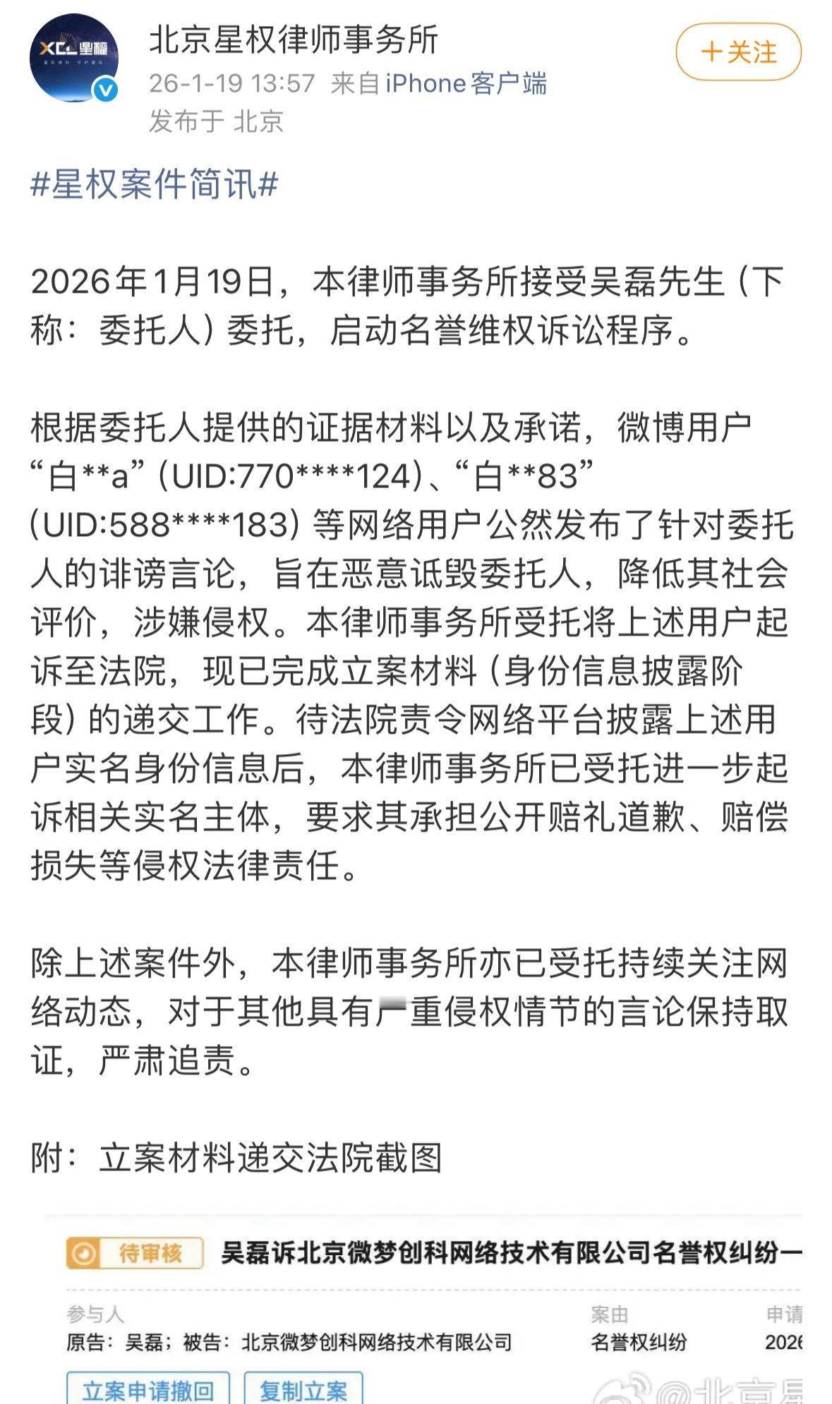 白纸黑字告的就是诽谤哈疯子进局子,蠢货都莫捱吴磊 不认识