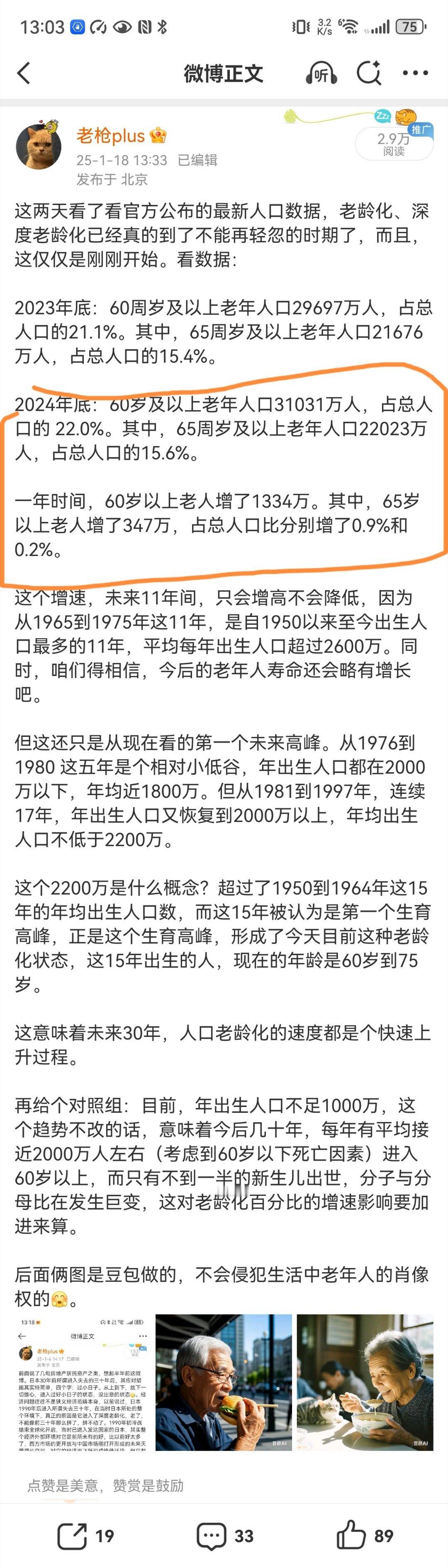 一年前(图一)看到2024年人口统计说了几段,今天2025年人口统计数据又发布了。还是看老年人口吧,60岁以上人口又增了1300余万,其中65岁以上老人又增了342万。如一年前所说,这个增加绝对值,今后只会高不会低,且以此为起始端,未来三十年会出现两次增长高峰,年增加值会出现相对大幅上升。以加速度加快老龄化和深度老龄化进程。冒昧说句:似乎社会方方面面还没有真正为此来做出调整和准备的意识。 比如,53岁的罗桑和58岁的贾老板,俩都快进入老年人行列的老登,还踏马都那么火爆