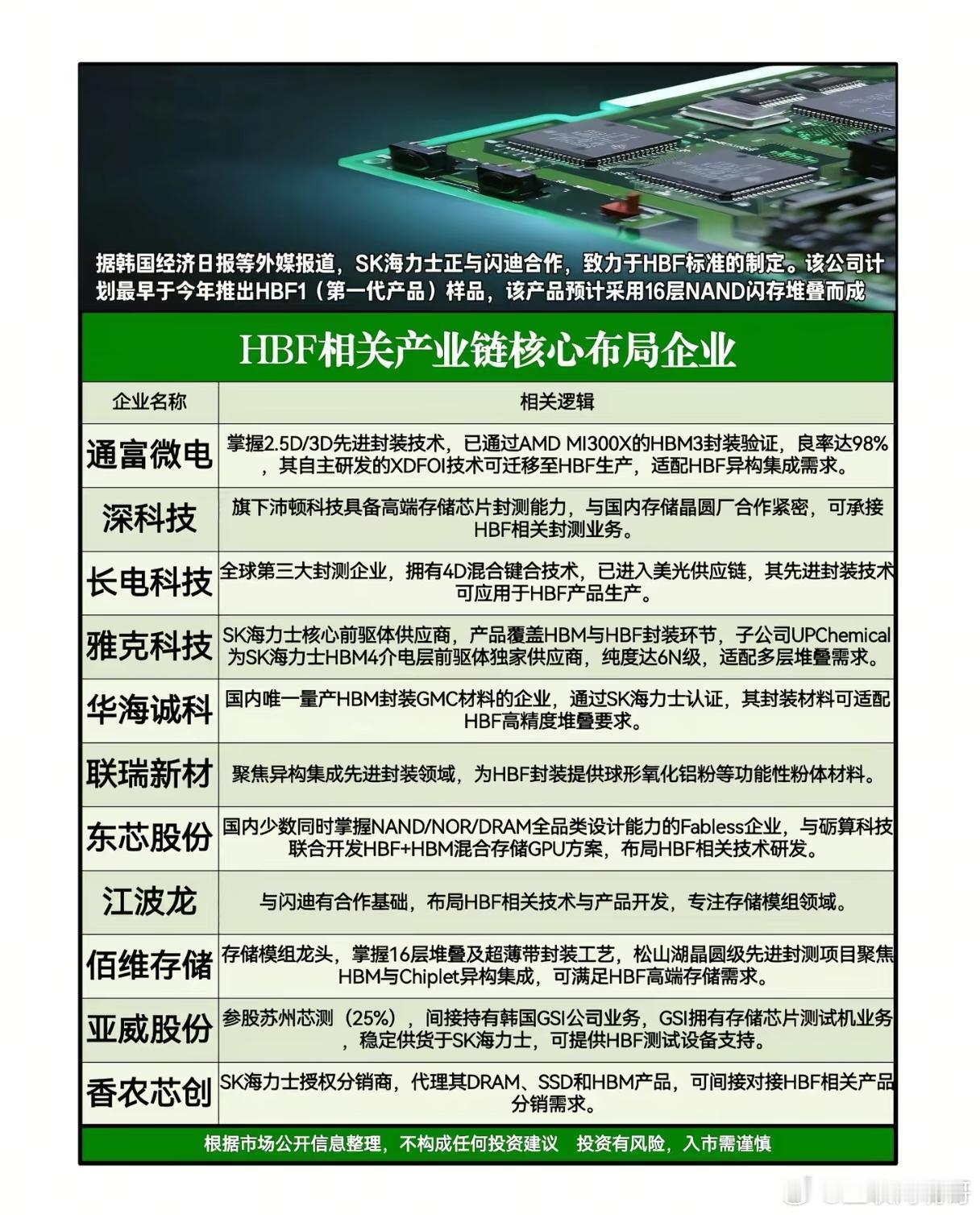 HBF会成为存储芯片的下一个“造富密码”吗?当SK海力士与闪迪联手敲定HBF标准、计划年内推出16层堆叠的HBF1样品时,一场存储芯片产业的新战事已然打响。这个被视为3D NAND技术迭代方向的新架构,不仅让韩国巨头押注未来,更让通富微电、长电科技等中国企业提前站上了赛道。从技术底层看,HBF以高带宽、高密度的特性,精准命中了AI算力爆发下的存储刚需。当大模型训练对存储带宽的需求以百倍级增长时,传统3D NAND的性能瓶颈日益凸显,而HBF通过16层乃至更高层数的垂直堆叠,可实现数倍于前者的传输效率,这让它成为AI服务器、高端PC等场景的“刚需配置”。更值得关注的是,中国企业并非旁观者:通富微电的XDFOI技术已完成HBF异构集成适配,长电科技的4D混合键合技术进入美光供应链,雅克科技更是成为SK海力士HBM与HBF双料前驱体供应商。这些布局不仅打破了海外技术垄断,更让中国产业链在下一代存储标准的制定中拥有了话语权。市场层面,HBF的爆发已现端倪。机构预测,到2028年全球HBF市场规模将突破百亿美元,而当前国内相关企业的技术储备正与产业需求形成共振。佰维存储的16层堆叠工艺、东芯股份的HBF+HBM混合存储方案,都在加速推动技术落地。随着SK海力士等大厂产能释放,HBF将逐步渗透消费级市场,从旗舰手机到固态硬盘,最终成为存储行业的“通用语言”。当然,机遇与挑战并存。HBF量产仍面临良率提升、成本控制等难题,而美韩企业在专利与设备上的先发优势,也让国内企业面临突围压力。但从HBM到HBF的技术演进中,我们看到中国产业链正在从“跟随者”转向“同行者”——华海诚科的GMC材料通过SK海力士认证、联瑞新材的球形氧化铝粉支撑高端封装,这些突破正构建起更坚实的产业底座。站在存储芯片的技术拐点上,HBF不仅是性能升级的载体,更是全球产业链重构的催化剂。对于投资者而言,它或许是下一个十年的“造富密码”;对于中国产业来说,这更是一次换道超车的关键机遇。当我们看到通富微电的封装良率突破98%、雅克科技的前驱体纯度达到6N级时,不难相信:在这场技术竞赛中,中国力量正在书写属于自己的答案。