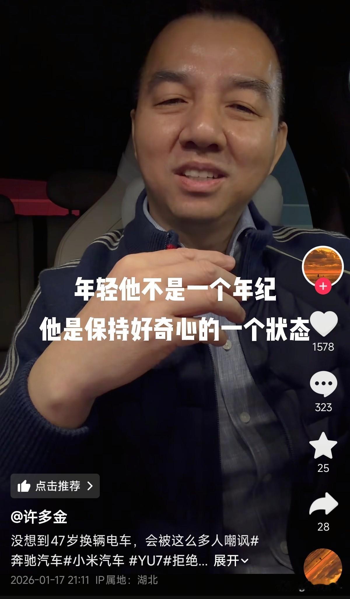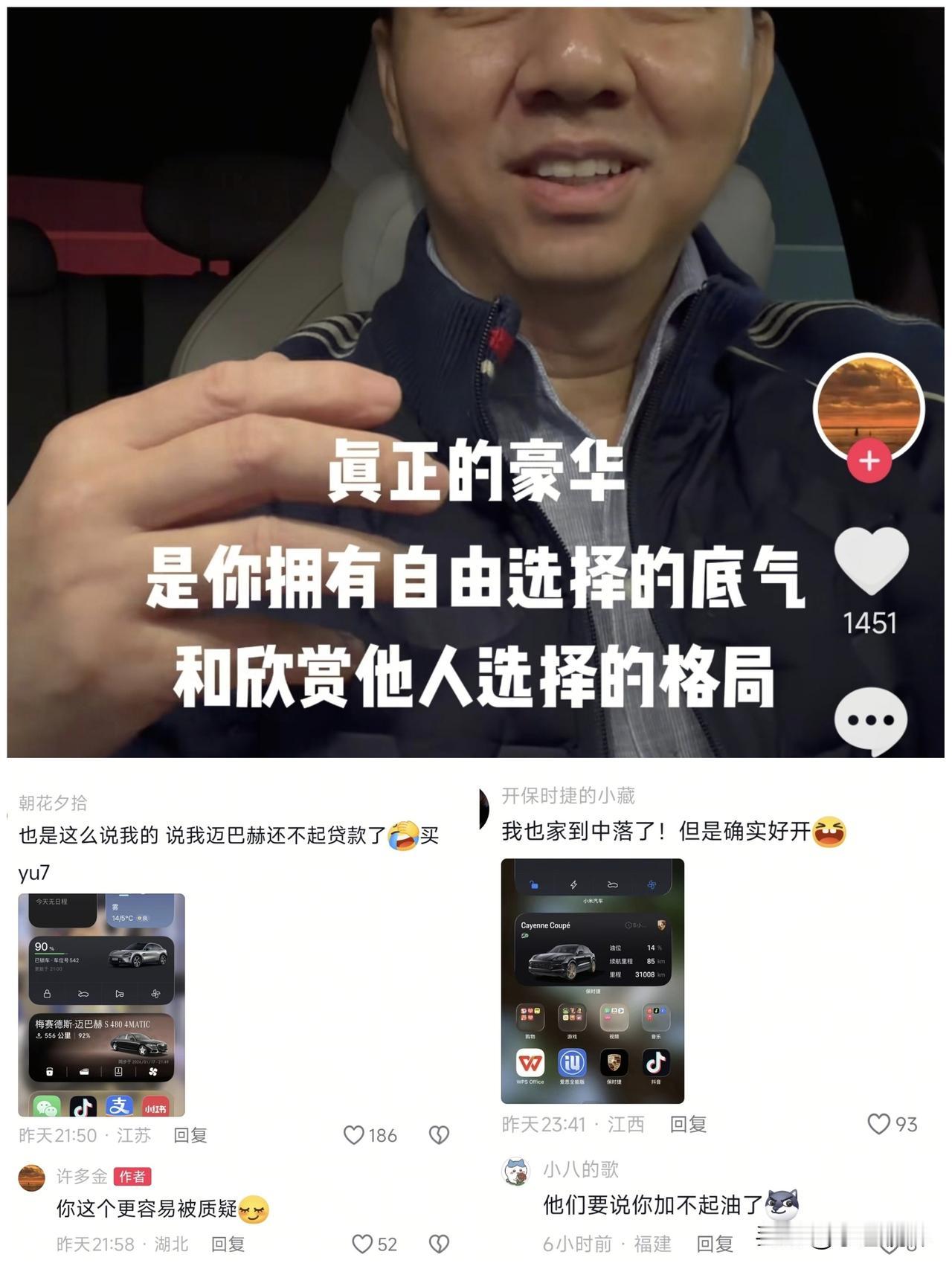 「真正的豪华,是你拥有自由选择的底气和欣赏他人选择的格局」。 评论区点赞很高的两个回答,一位是迈巴赫&小米双车主,另一位是保时捷&小米双车主。 视频中的车主是一位从奔驰车换到小米YU7的车主,第一天发布视频后被很多人质疑,后来慢慢的画风变了,很多小米车主分享了自己的体验。 接下来,这位车主的三段话,绝对凸显了自身的格局、涵养与心态: 1、我们可能选择的不是一辆车,而是一起选择了自己生活的一种态度。 2、年轻他不是一个年纪,他是保持好奇心的一种状态。 3、如果你懂得欣赏不同的人,我觉得你往往也可能是,能掌控人生节奏的那个人。 借用车主的四段话送给所有小米车主、所有小米粉丝所有现在用户和所有心怀善意的网友,愿你们永远被「温柔以待」。