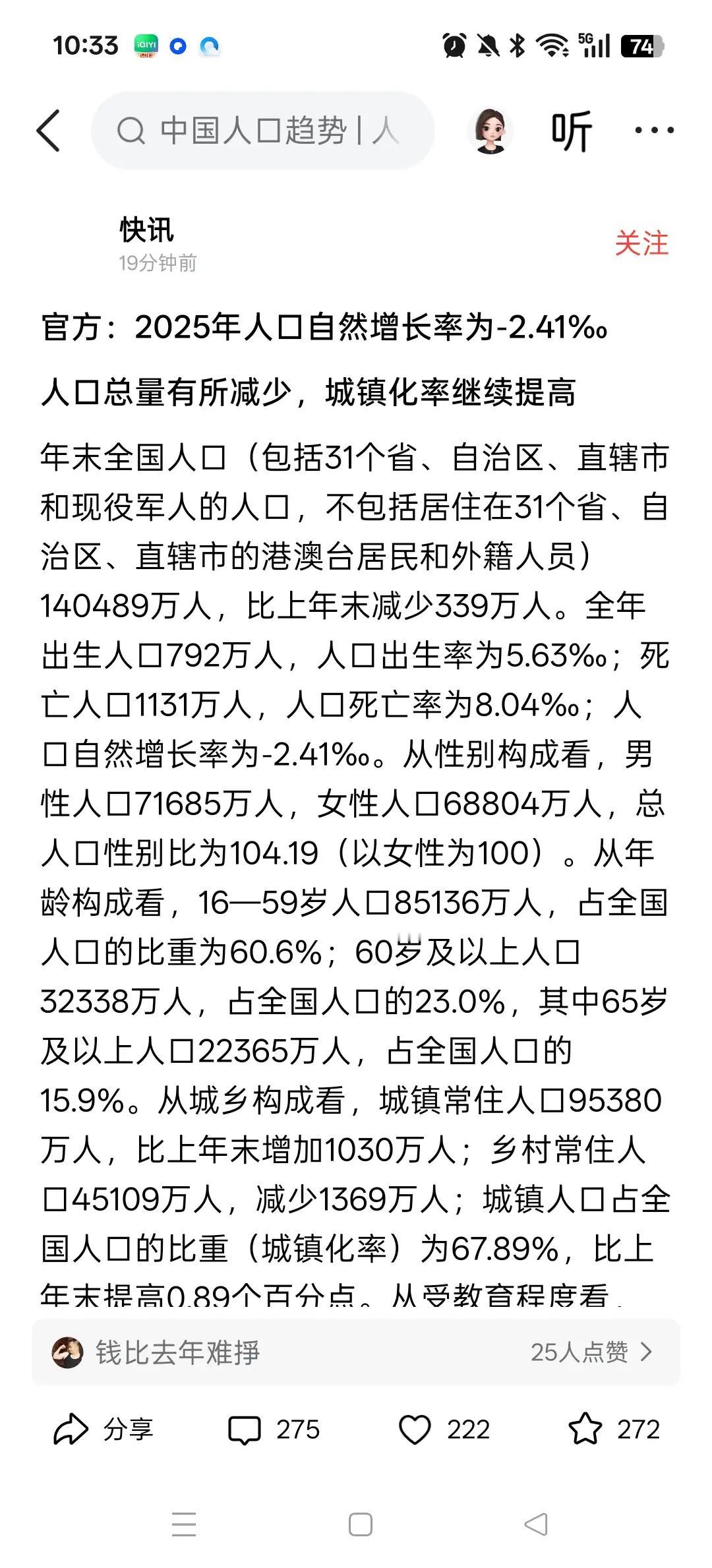 今天国家统计局发布了两个消息,一个好消息是,2025年中国GDP达1401879亿元,比上年增长5%,140万亿的GDP,背后是亿万人民的辛勤汗水与幸福期盼。来之不易,祝伟大祖国繁荣昌盛,社会安定和谐,人民幸福安康!140万亿元,是亿万奋斗者共同托举的新坐标。这5%的增长里,凝结着产业升级的锐气、市场内生的韧性,以及高质量发展道路上行稳致远的中国智慧与中国力量! 140万亿的GDP,背后凝聚的是亿万人民的辛勤汗水与幸福期盼。愿这份发展的红利,更公平、更直接地惠及每一位奋斗者!让民众与发展同进,让幸福与发展同在!让时代的红利成为每一个家庭坚实的基础和保障!每一位奋斗者也要知道国内外复杂环境下这一份增长来之是多么得不容易。国泰民安不是总结,是国家的努力和个人努力共同的结果。没有战争纷扰的担心,不怕贸易战的大棒!这份安全感是祖国给的!同心同力是每一位奋斗者应该记住的!剩下的就是相信国家! 国家统计局有发来了一个令人担忧的消息!!根据国家统计局发布,2025年末全国人口140489万人,比上年末减少339万人,全年出生人口792万人,人口自然增长率为-2.41‰, 从性别构成看,男性人口71685万人,女性人口68804万人,总人口性别比为104.19(以女性为100)。从年龄构成看,16—59岁人口85136万人,占全国人口的比重为60.6%;60岁及以上人口32338万人,占全国人口的23.0%,其中65岁及以上人口22365万人,占全国人口的15.9%。从城乡构成看,城镇常住人口95380万人,比上年末增加1030万人;乡村常住人口45109万人,减少1369万人;城镇人口占全国人口的比重(城镇化率)为67.89%,比上年末提高0.89个百分点。从受教育程度看,16—59岁人口平均受教育年限达到11.3年,比上年提高0.1年。 如果按照这个趋势发展,将在2026年年底的时候,我国的人口将跌入13亿以内啊,令人担忧啊。