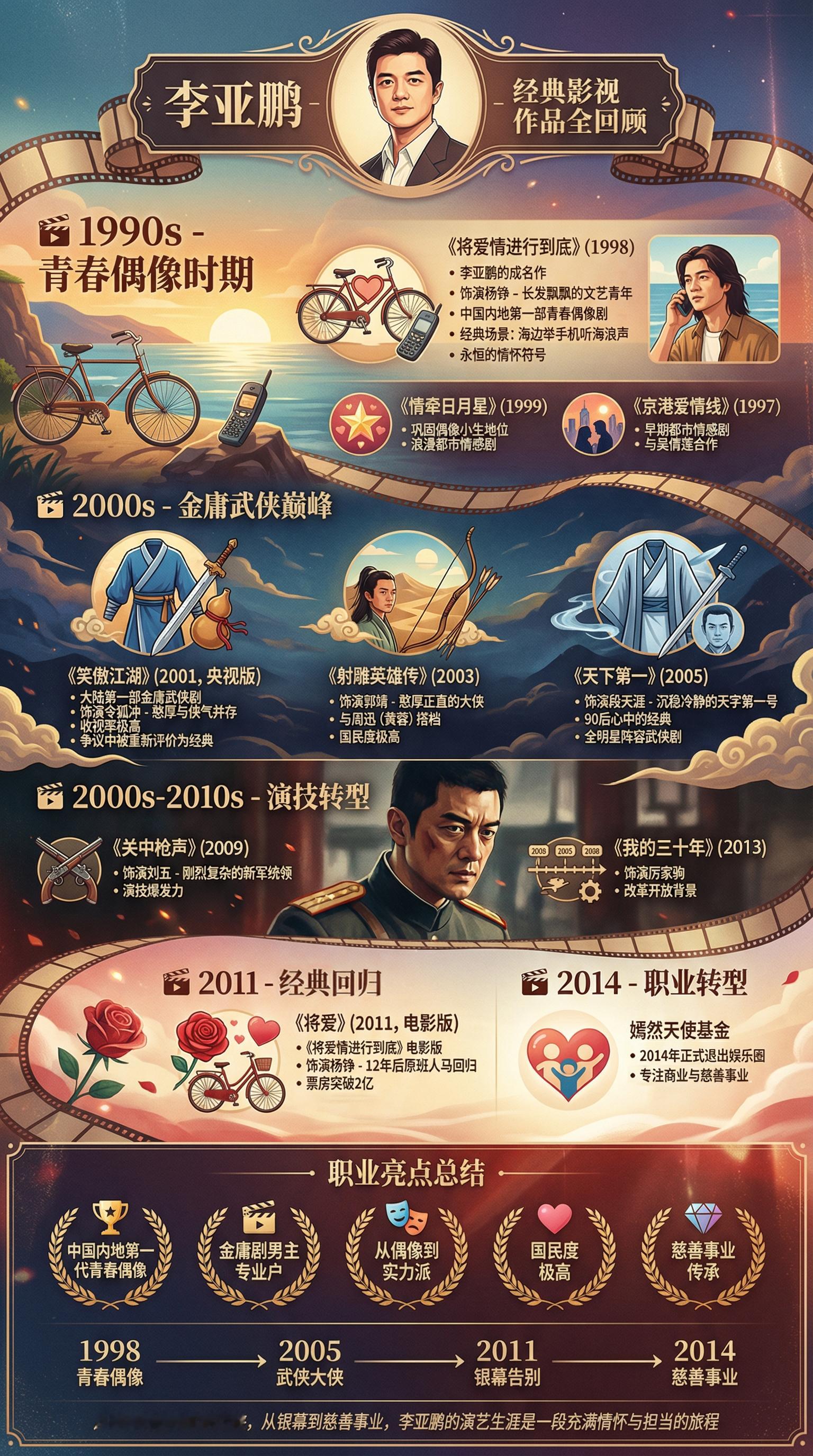 同事用AI结合近期李亚鹏的热点做的2张图,信息图展示了嫣然天使医院及李亚鹏的经典影视作品,分享给大家
