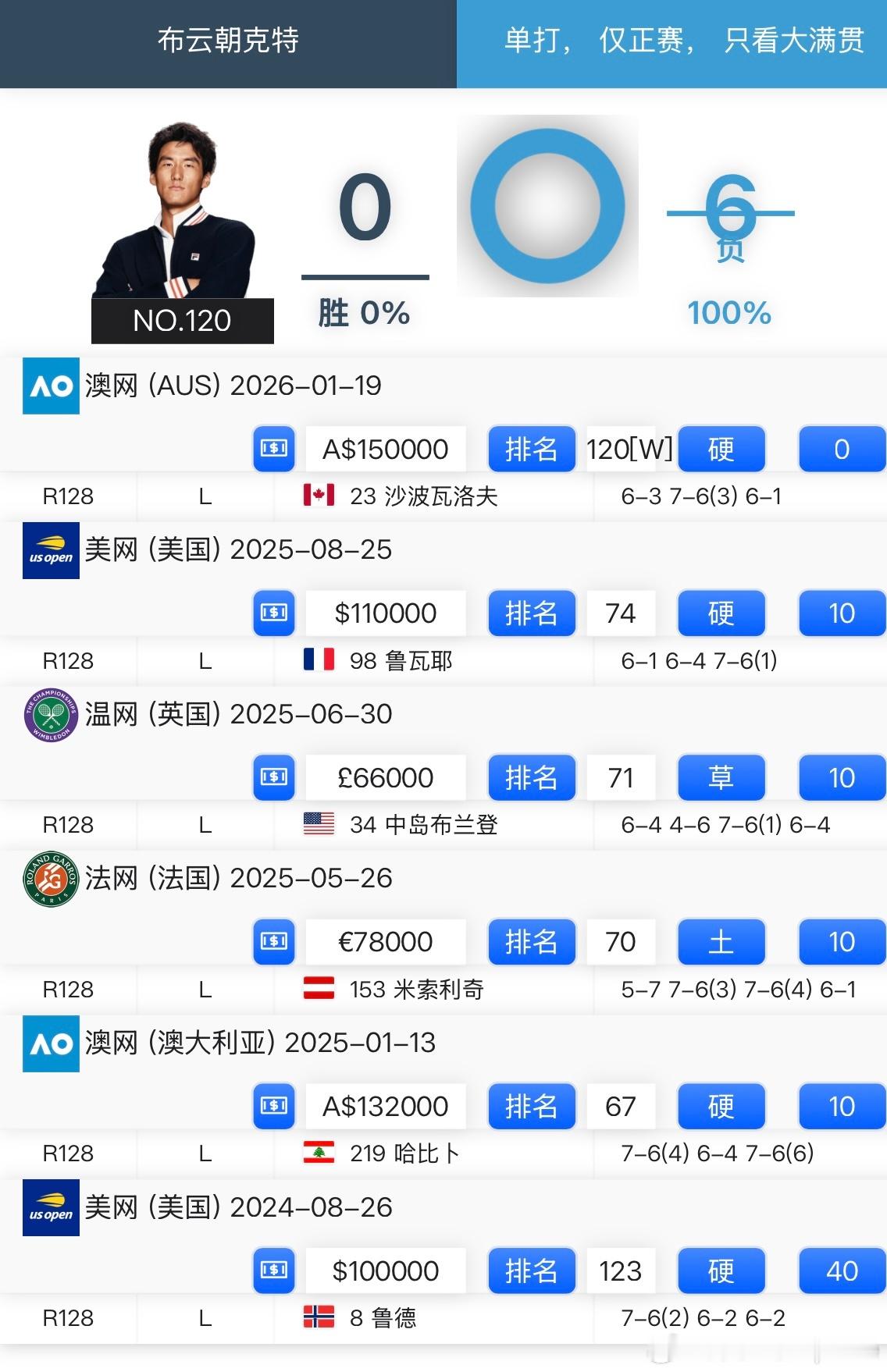 布云朝克特止步澳网男单首轮不知不觉小布已经6次出征大满贯了,比较遗憾的是每一场都会丢抢七8次抢七都没能拿下希望今年法网、温网还可以入围正选布云朝克特6次冲击大满贯正赛首胜均告负:2024🇺🇸美网🇨🇳布云朝克特6-7/2-6/2-6鲁德🇳🇴No.82025🇦🇺澳网🇨🇳布云朝克特6-7/4-6/6-7 哈比卜🇱🇧No.2192025🇫🇷法网🇨🇳布云朝克特7-5/6-7/6-7/1-6米索里奇🇦🇹No.1552025🇬🇧温网🇨🇳布云朝克特4-6/6-4/6-7/4-6 中岛布兰登🇺🇸NO.342025🇺🇸美网🇨🇳布云朝克特1-6/4-6/6-7 鲁瓦耶🇫🇷No.982026🇦🇺澳网🇨🇳布云朝克特3-6/6-7/1-6沙波瓦洛夫🇨🇦No.23布云朝克特0比3沙波瓦洛夫澳网2026