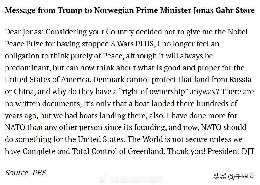 我早说了,二手的奖项不能满足老川普。[捂脸] 特朗普向挪威首相发送了一条信息,称由于自己没有获得诺贝尔和平奖,他已经不再觉得有“只从和平角度思考问题的义务”。 唉。你说说诺贝尔评奖委员会这票鸟人啊。你们惹了多大祸???!! 你们那个破奖以前从来没有过什么正儿八经用。唯一一个能有点用的时候,你们偏偏不发给这哥们!! 将来中国强大了应该组织个军事法庭把你们当战犯审!!