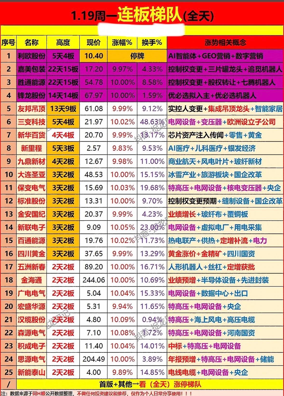 1月19日今日连板梯队股市风云变幻,智慧投资如棋。 "多股涨停!电网设备、机器